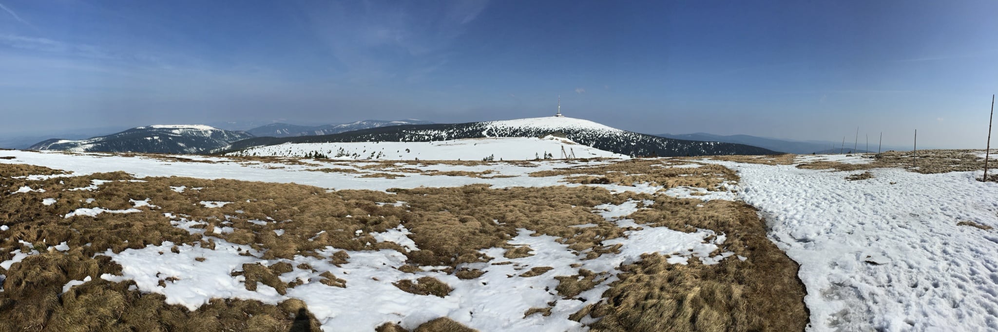 Na Klínovci se pokocháme výhledem, uděláme pár rychlých fotek a jdeme dál. Následující úsek je zdlouhavý a namáhavý, jde se stále do kopce. Sníh se občas boří, občas klouže, ale pořád je ho hodně moc. Přecházíme přes Výrovku, Malý Jezerník a sedlo Velký Jezerník. U chaty Švýcárna se nám otevře výhled na Praděd, na kterém se majestátně tyčí vysoký televizní vysílač. Vypadá na dosah, ale máme to k němu ještě nepříjemné 4 kilometry plné stále rozbředlejšího sněhu. Trvá nám to ještě celou hodinu, ale pak si s úlevou můžeme odpípnout třetí kontrolu (a dojít na záchod).