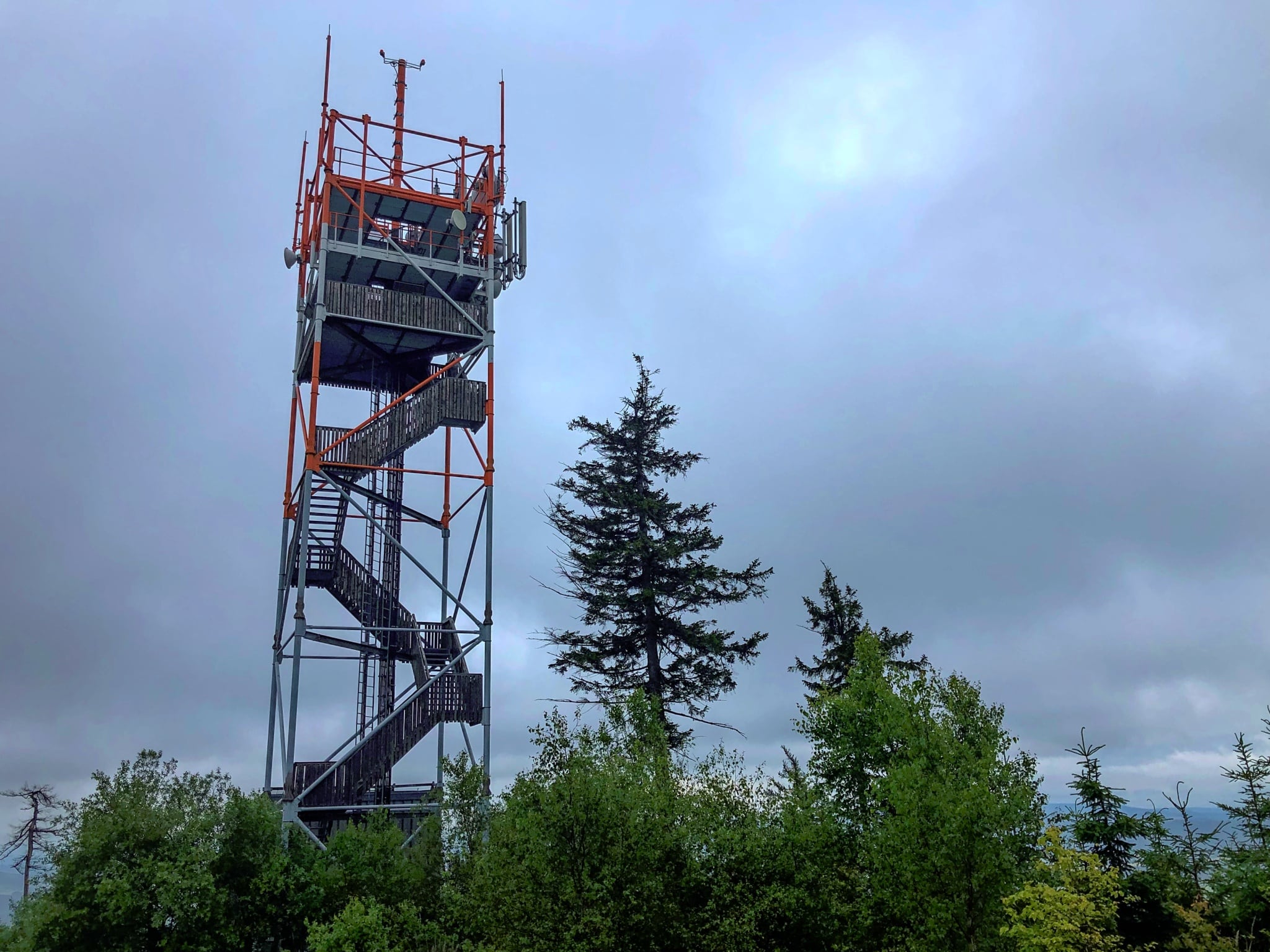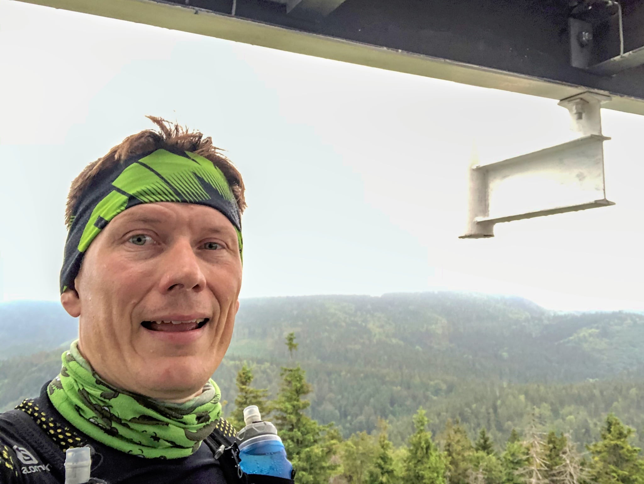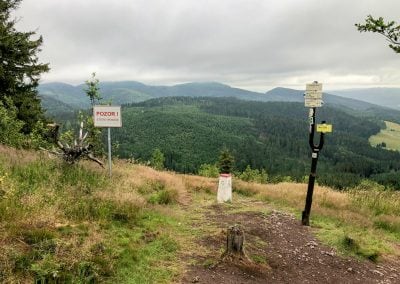 Nahoře na kopci už to tak veselé není. Za úkol máme spočítat počet schodů na vrchol rozhledny, což není problém, horší je se s mým kolenem dostat přes těch 100 schodů zase dolů. Když se mi to konečně povede, začíná pršet, tak si raději beru bundu. Chvilku se bavím s Ondrou, pak si ještě na rozloučenou fotím rozhlednu a po hranici s Polskem začínám sestupovat. Což je pro mé koleno jedním slovem peklo! Chvílemi jdu bokem, jinak to nejde. Místo abych si užíval krásné přírodní scenérie a konečně dlouhé úseky bez asfaltové pokrývky, hekám, sykám a vzdychám, a nadávám si, že jsem ten vlak v Meziměstí nechal ujet. Jediné pozitivum vidím v tom, že už mám za sebou polovinu pochodu, takže teď už se vlastně vracím zpátky.