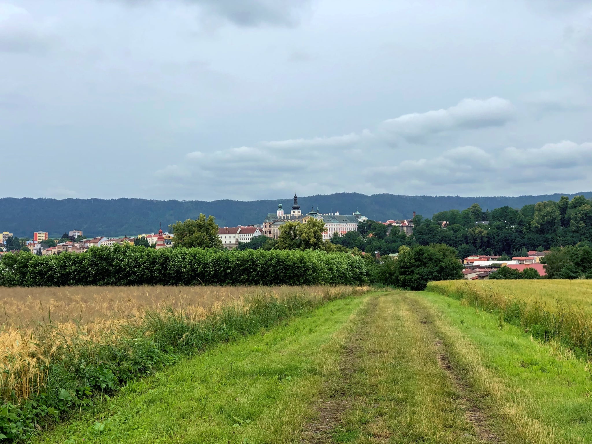 Kontrolu nalézám bez problémů, stejně tak snadno si do karty zapisuji letopočet vzniku památníku. Jedinou nepříjemnost představuje počasí, které se stále zhoršuje a občasné přeháňky přechází do vytrvalého deště. Naštěstí ani tentokrát mu to dlouho nevydrželo, za půl hodiny je zase relativně sucho. Kousek za Červenou horou začání dlouhé, skoro 8 kilometrů dlouhé klesání do Broumova. To už z poloviny vede zase po asfaltu, ale mírný sklon mi vyhovuje a tak kilometry zase pěkně naskakují. Broumovem více méně jen proletím, nebýt vedle rozsáhlého Benediktinského kláštera dlouhé schodiště, ani bych nezpomalil.