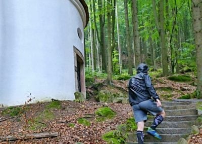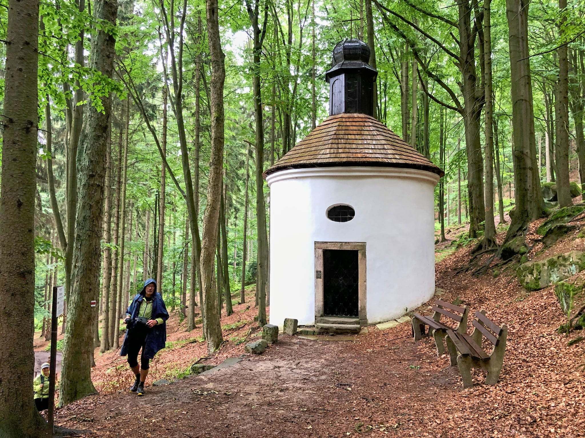 Za Broumovem načínám poslední třetinu dnešního pochodu. A nutno dodat, že asi tu nejnamáhavější. Z počátku to tak nevypadá, cesta mezi poli není ani zábavná, ani obtížná, ale kromě stále silnějšího deště mě nic netrápí. Akorát ten kopec předemnou mi trochu nahání obavy, je vážně vysoký a něco mi říká, že se asi podívám nahoru. A taky že ano! Jen co překročím hranici rezervace Broumovské stěny, u kaple Panny Marie začíná nepříjemné stoupání. Více méně po schodech, ať už přírodních, nebo umělých. Všechno je mokré a klouže to, na druhou stranu se cítím dobře a sil mám na rozdávání. Za čtvrt hodinu jsem nahoře.