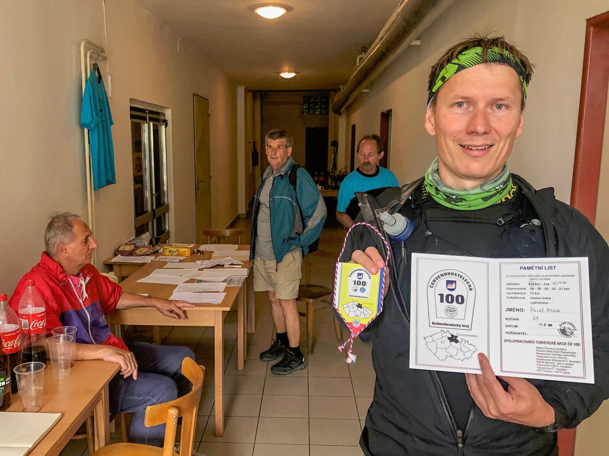 V cíli mě vítá hlavní organizátor i Olaf. Dostávám diplom a pamětní vlaječku, podle času jsem prý skončil na 10. místě. Vida, moje první umístění v top 10 je na světě. 🙂 Na chvilku si sedám a klábosím s ostatními. Ale brzy se do mě dá zima, tak se jdu převléknout do suchého. Obzvlášť nohy si to zaslouží, byly mokré více méně nonstop. Ještě chvíli se účastním konverzace, ale pak už je čas vydat se na cestu. Loučím se, nasedám do auta, a s úderem páté hodiny pro mě Červenokostelecká stovka definitivně končí.