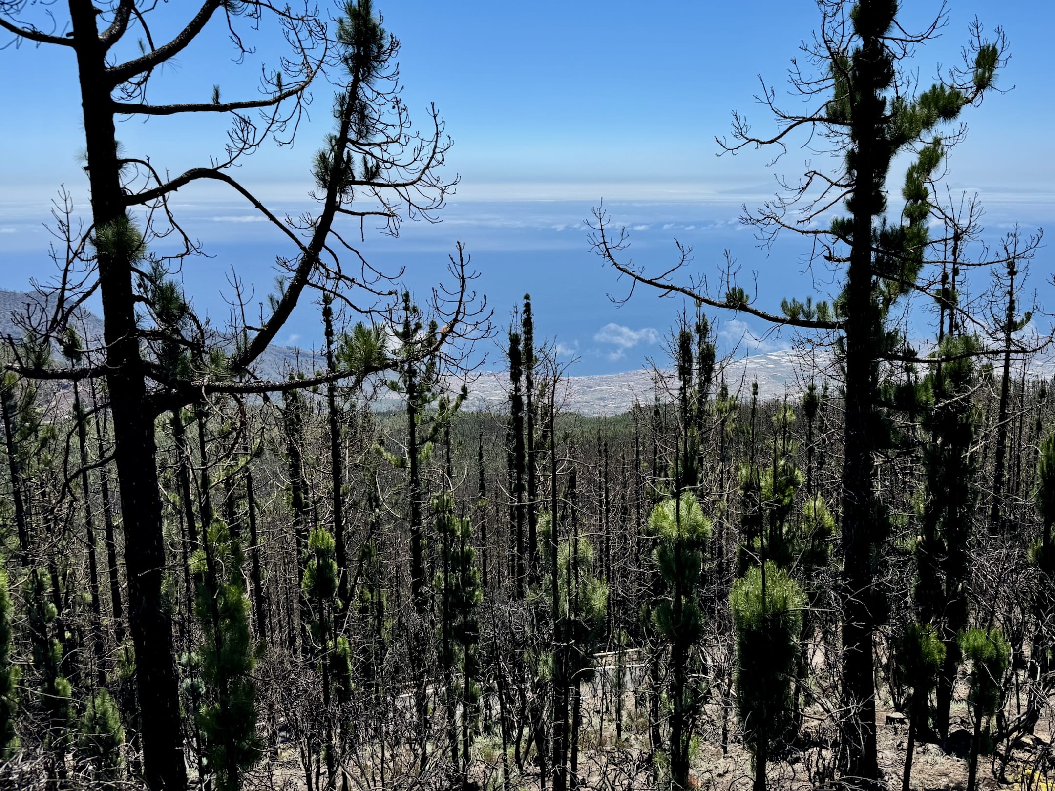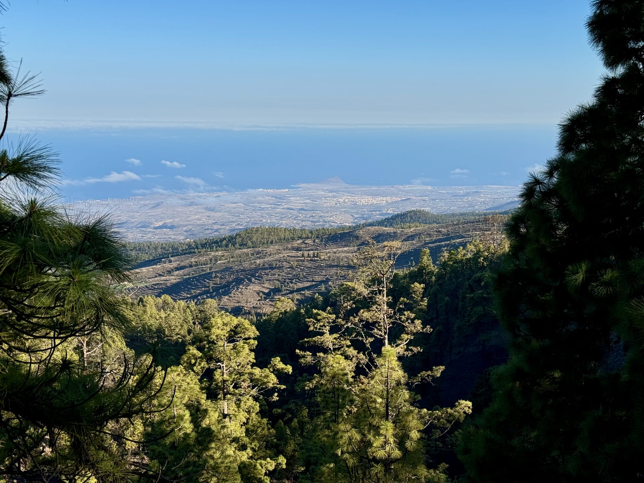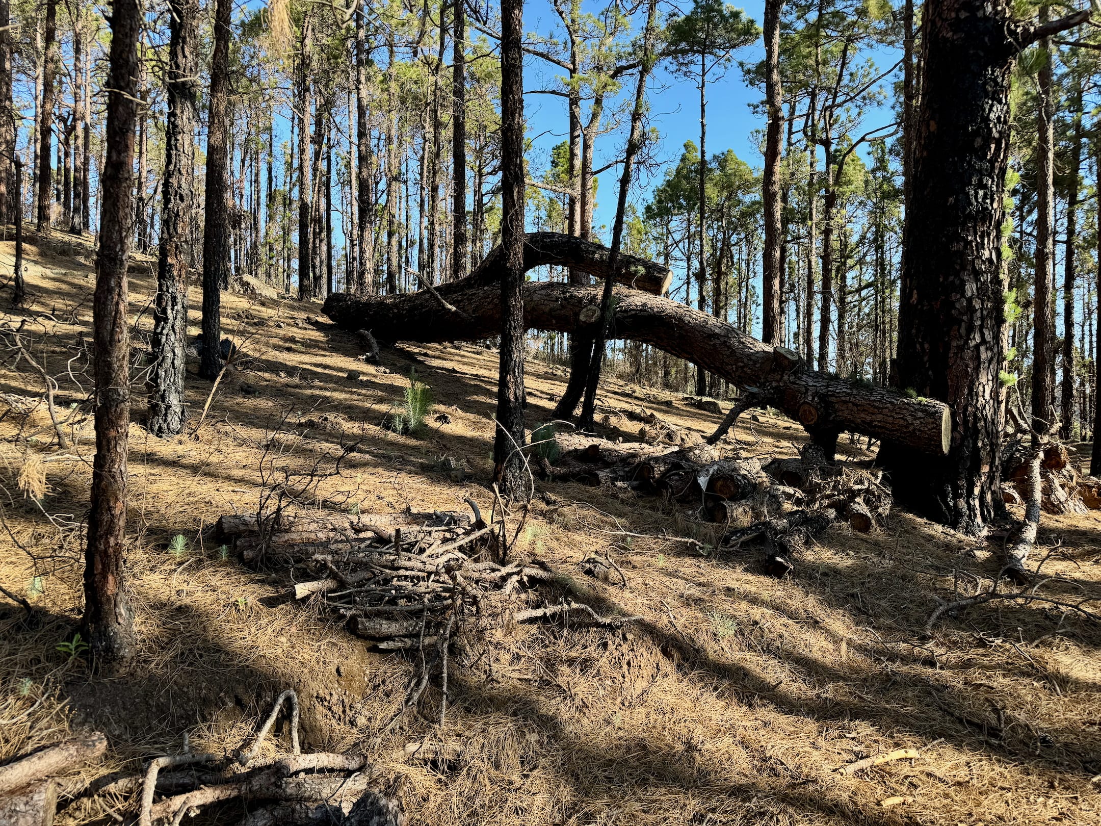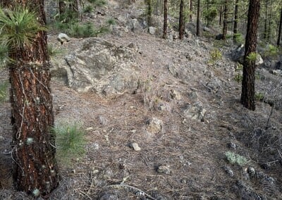 Začíná to být míň zábava. Sluníčko peče a protože je po poledni, je vysoko na obloze a stromy kolem silnice už jsou skoro bez stínu. Cesta je pořád do kopce a z asfaltu mě bolí mě nohy. A když už se někde objeví zajímavá postranní cesta, dost často je za závorou s jasně vyznačeným zákazem vstupu. Naštěstí se blížím k hranici parku Teide, kde by mohla být zábava alespoň o malinko lepší.