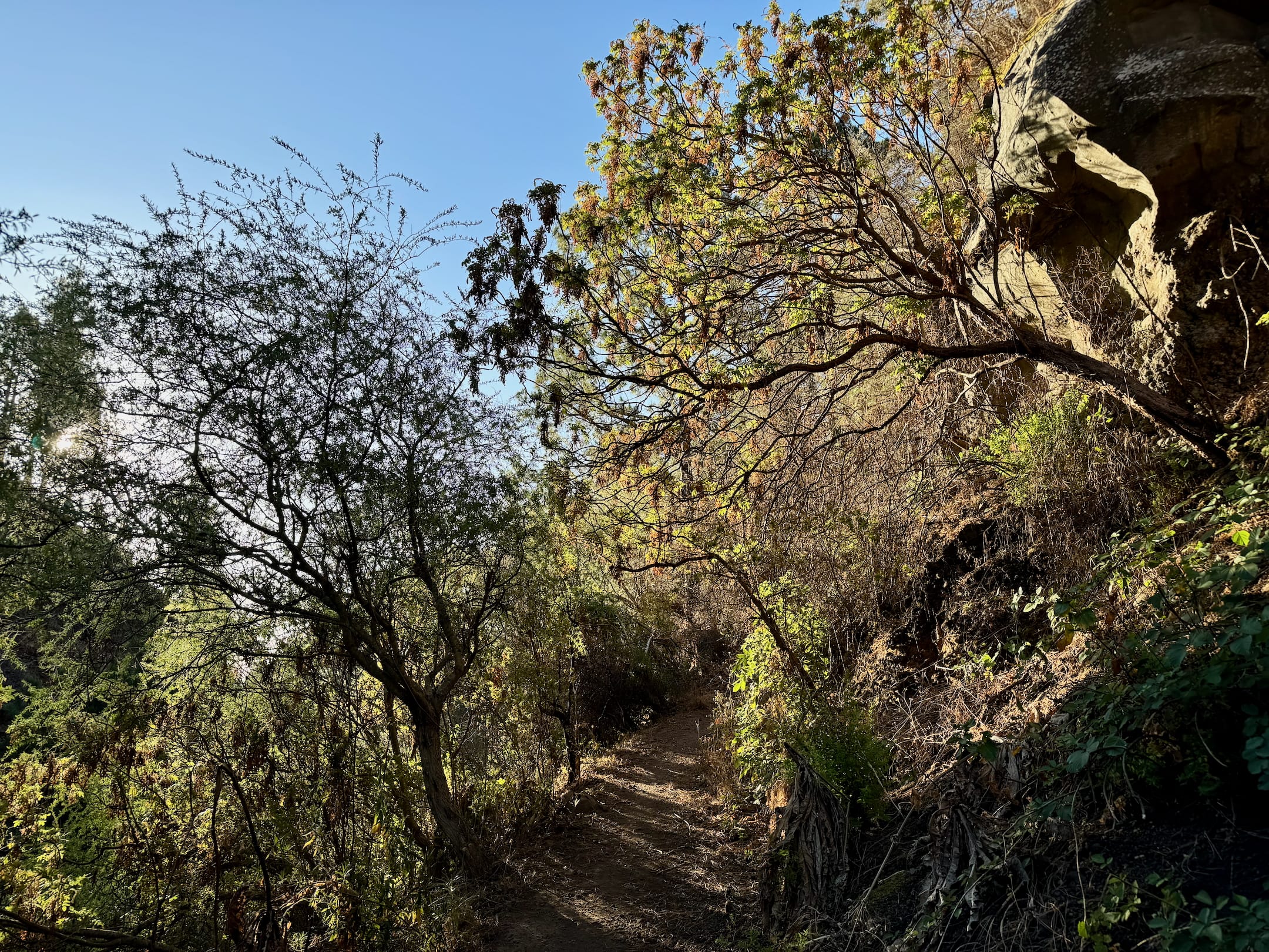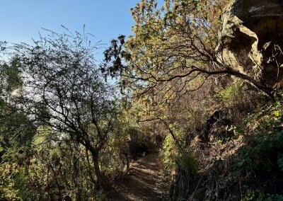 Uplynula další hodina, začíná se šeřit. A já jsem na tom úplně stejně, jako před 60 minutami, počet vhodných míst k přenocování je stále roven čisté nule. Začínám být malinko nervózní. Ne, že bych po téhle cestě nedokázal jít s čelovkou, ale už mám za sebou 50 kilometrů, dneska potřebuju odpočinek jako sůl. Nakonec se na mě ale paní Štěstěna usměje. V údolí Barranco del Río se hlavní silnice pro auta dělí a já pokračuji po očividně mnohem méně frekventované odbočce, ze které po pár desítkách metrů navíc opět odbočím a po úzké pěšince začínám prudký sestup mezi stromy. To vypadá nadějně!