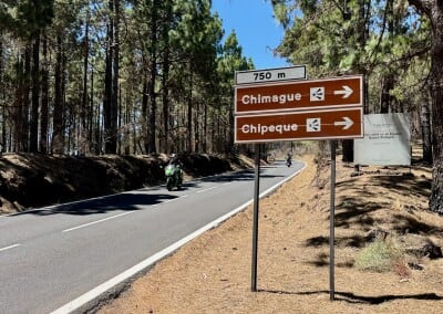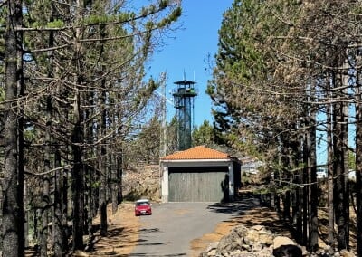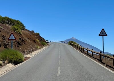 I když je to pořád do kopce, chůze po silnici není extra náročná. Mnohem víc je nudná. O zábavu se mi starají jen občasné krásné výhledy na Teide a sebevrazi na motorkách, kteří se ze svých strojů snaží vyždímat maximum. Už chápu, proč tu u silnice mají tolik varování. Z rutiny mě měla vyvést jakási rozhledna na kopci El Gaitero, ale zdá se, že je to nějaká telekomunikační věž a že o návštěvníky tam rozhodně nestojí. Alespoň podle nápisů. Tak si ji alespoň z dálky vyfotím a jdu zpátky na silnici.