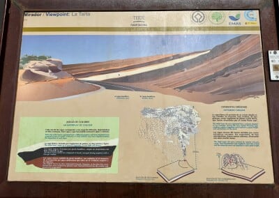 Po chvíli odbočuji z asfaltky na prašnou cestu a zahajuji dlouhý sestup po úbočí centrálního skalního masivu. Plánoval jsem si to sice vzít po hřebeni, ale jak jsem hned třetí den zjistil, kvůli vojákům je to tam zavřené. Tak to asi nebude tak pěkné. Informační tabule u vulkánu Fasnia se ukáže být na dlouho posledním alespoň trochu zajímavým bodem, jinak to následující hodiny bude jen prach, pot a vedro.