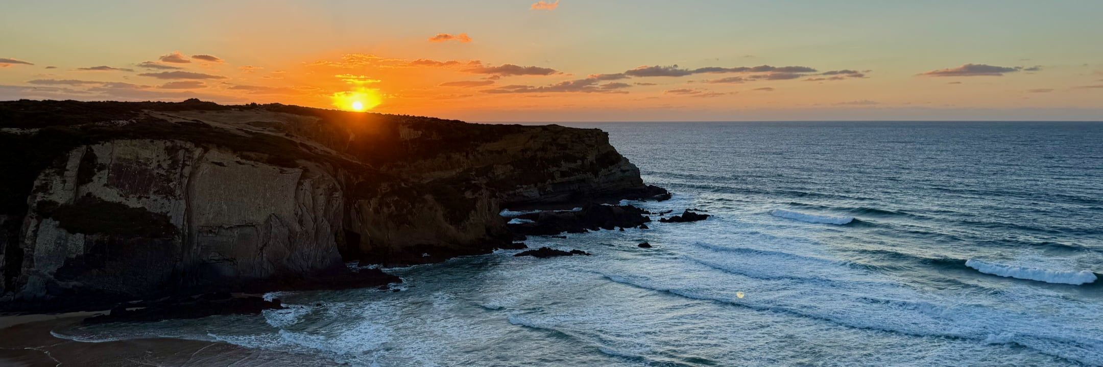 Ve vesnici Carrapateira jsem si dal pořádný oběd. Burger s kozím sýrem byl sice netradiční, ale chutnal skvěle. Jako dezert jsem zvolil portugalskou specialitku Bolo Bolacha a k tomu kafe s mlékem. Nakonec jsem si prošel pár ulic vesnice a navštívil i místní kostelík. Dál jsem se vydal k moři, na návštěvu velké delty řeky Carrapateira a sousedící obrovské pláže Praia da Bordeira, která je neuvěřitelně obrovská! Cestou do vnitrozemí k dnešnímu ubytováním jsem potkal polský páreček, kde obzvlášť slečna neměla svůj den – rozbila si koleno do krve a ztratila bundu. Ale zvládli to i bez mojí pomoci. Západ slunce byl dneska obzvlášť kouzelný, stejně jako ubytování v komplexu budov nazvaných Barranco da Fonte.