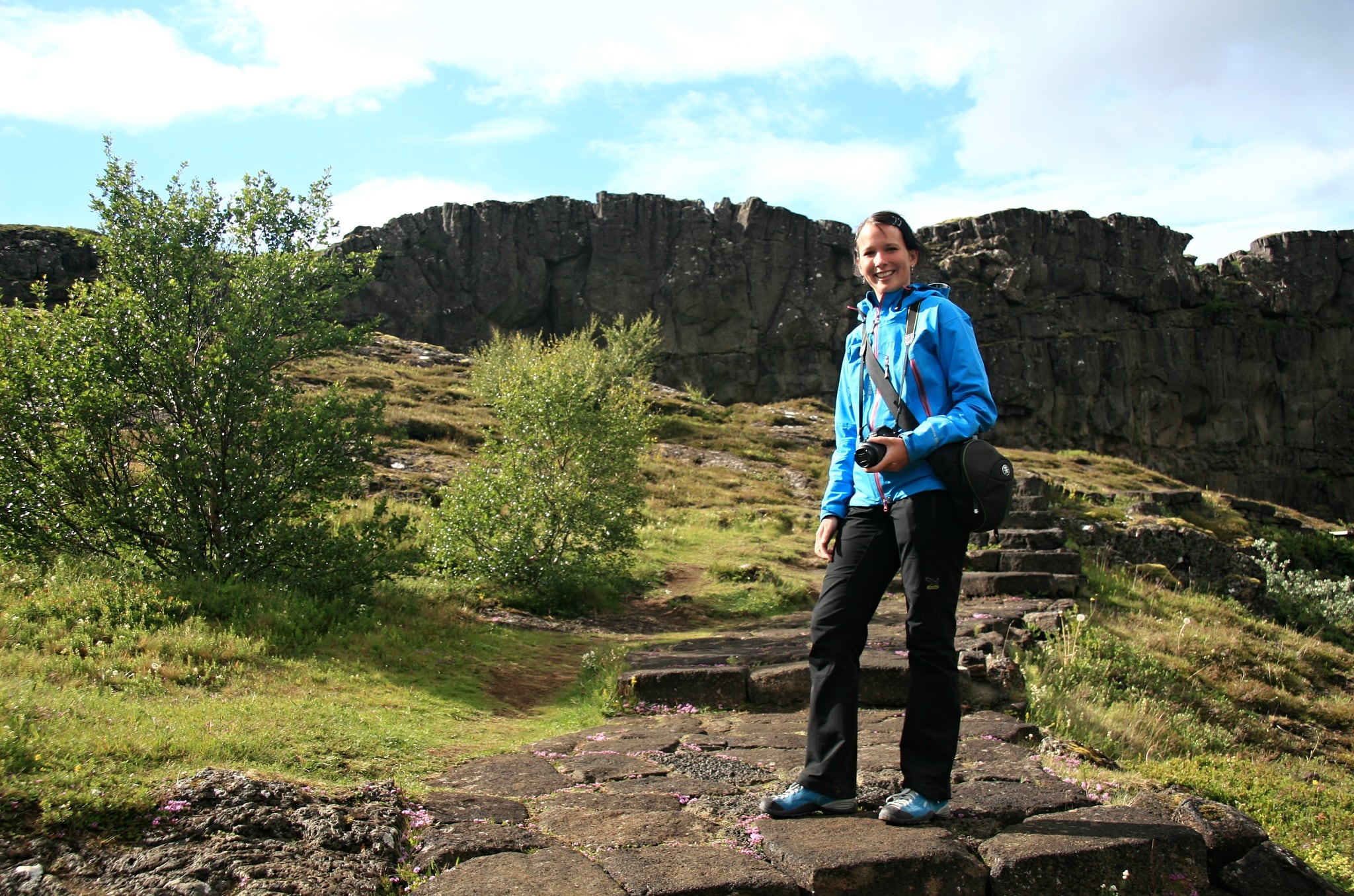 Naše první kroky vedou na procházku do koridoru mezi několik metrů vysoké čedičové stěny. Sluníčko skutečně vylezlo, ale černé mraky se pořád drží v nepříjemné vzdálenosti. Kromě jednoho z mála nízkých lesíků na Islandu obdivujeme i malý vodopád Oxarárfoss na řece Öxará, který ohraničuje jednu z vyhlídkových cest.