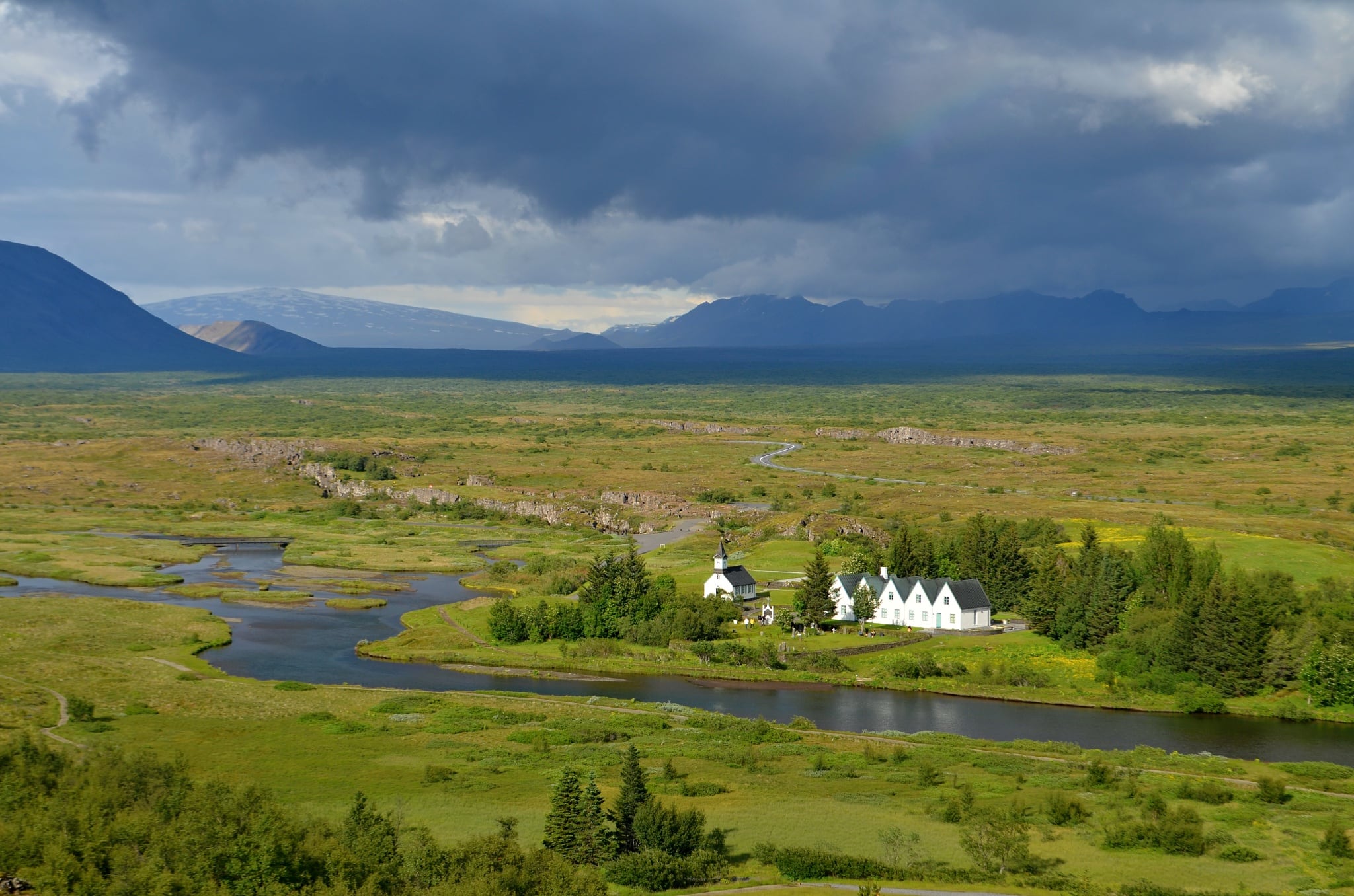 Během focení se prudce zhoršilo počasí a přišel silný déšť. Tedy spíš průtrž mračen, před kterou jsme se schovali do místní restaurace. Dali jsme si něco malého k jídlu a pití a čekali, až se déšť přežene. Vzhledem k jeho intenzitě to naštěstí netrvalo dlouho. A protože jsme měli už všechno prošlé a nafocené, zamířili jsme rovnou k autu a vyrazili na poslední naplánované místo. Do Þingvelliru. Nejdříve se jedeme na tuto oblast podívat shora. Teprve pak sjíždíme na dolní parkoviště, kdy asi hodinu čekáme, až přestane pršet a doufáme, že vykoukne i sluníčko.