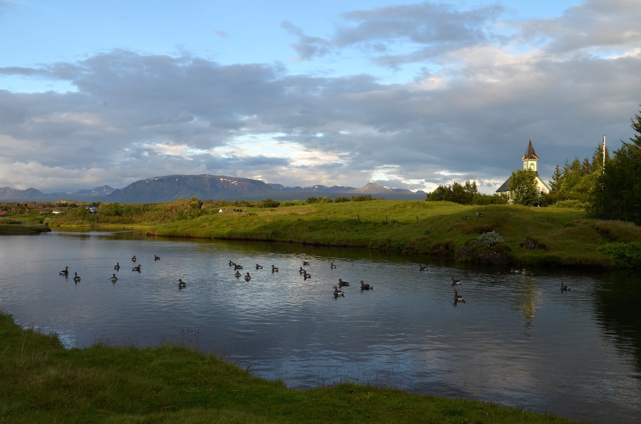 Mnohem více se ale těšíme na focení malého kostelíku v Þingvelliru spolu s pěti sousedícími domky, které díky své bílé barvě vypadají při vhodném nasvícení naprosto kouzelně. Z počátku to sice vypadalo, že odjedeme s nepořízenou, ale po hodině strávené v autě se na nás nakonec usmálo štěstí i sluníčko a než se schovalo za kopce na obzoru, umožní nám vyfotit několik úžasných fotek. Samozřejmě si jdeme prohlédnout i historicky cenná místa, ale na informačních tabulích nebyl „genius loci“ moc patrný.