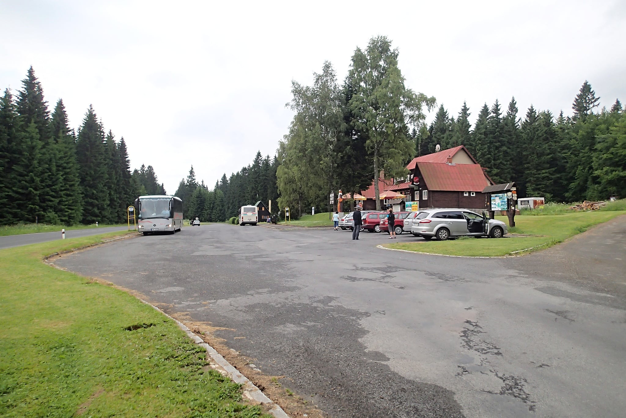 Otevřeno naštěstí je. Sedáme si ke stolku na zahrádce, objednáváme dvě polévky, pivo a Kofolu. Spolu s námi sedí u stolku „otec a syn“, u vedlejšího se občerstvuje čtveřice dalších kačerů a během našeho hodování dorazí ještě pár dalších. Navzájem se trochu hecujeme, občas má někdo mírně poraženeckou náladu, ale relativně blízký cíl spolu s velmi nepravidelnou dopravní obsluhou nakonec přesvědčí skoro každého, že končit teď je nemoudré. Česneková i hovězí polévka jsou vynikající a do žil nám vlévají spoustu energie. Už hodně bolavé nohy si vynutí druhou dávku Ibalginu, ale na cestu se vydáváme ještě než může zabrat. Před námi je poslední část pochodu a na jejím konci čeká Praděd.
