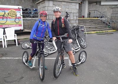 Po nezbytném focení a vzájemné gratulaci na lavičce před vysílačem doplňujeme kalorie a tekutiny. Prohlížíme si nohy, vyměňujeme ponožky, převlékáme trička. Hanka si posezení „zpříjemní“ vytahováním hned dvou klíšťat, naštěstí úspěšným. Ale čas letí jako splašený a je na čase začít plánovat cestu domů. Autobus z Ovčárny na Hvězdu jezdí každou hodinu v přesně půl, a protože nám spoj do Olomouce jede za pět minut tři, je nejvyšší čas vyrazit. Velmi lákavou pomocí pro cestu na Ovčárnu se zdají býti koloběžky, jdeme je tedy vyzkoušet. Za pouhých 100 Kč na osobu jsme vyměnili bolestné klopýtání z Pradědu za 10 minut adrenalinového sjezdu, prostě sladká tečka na závěr.