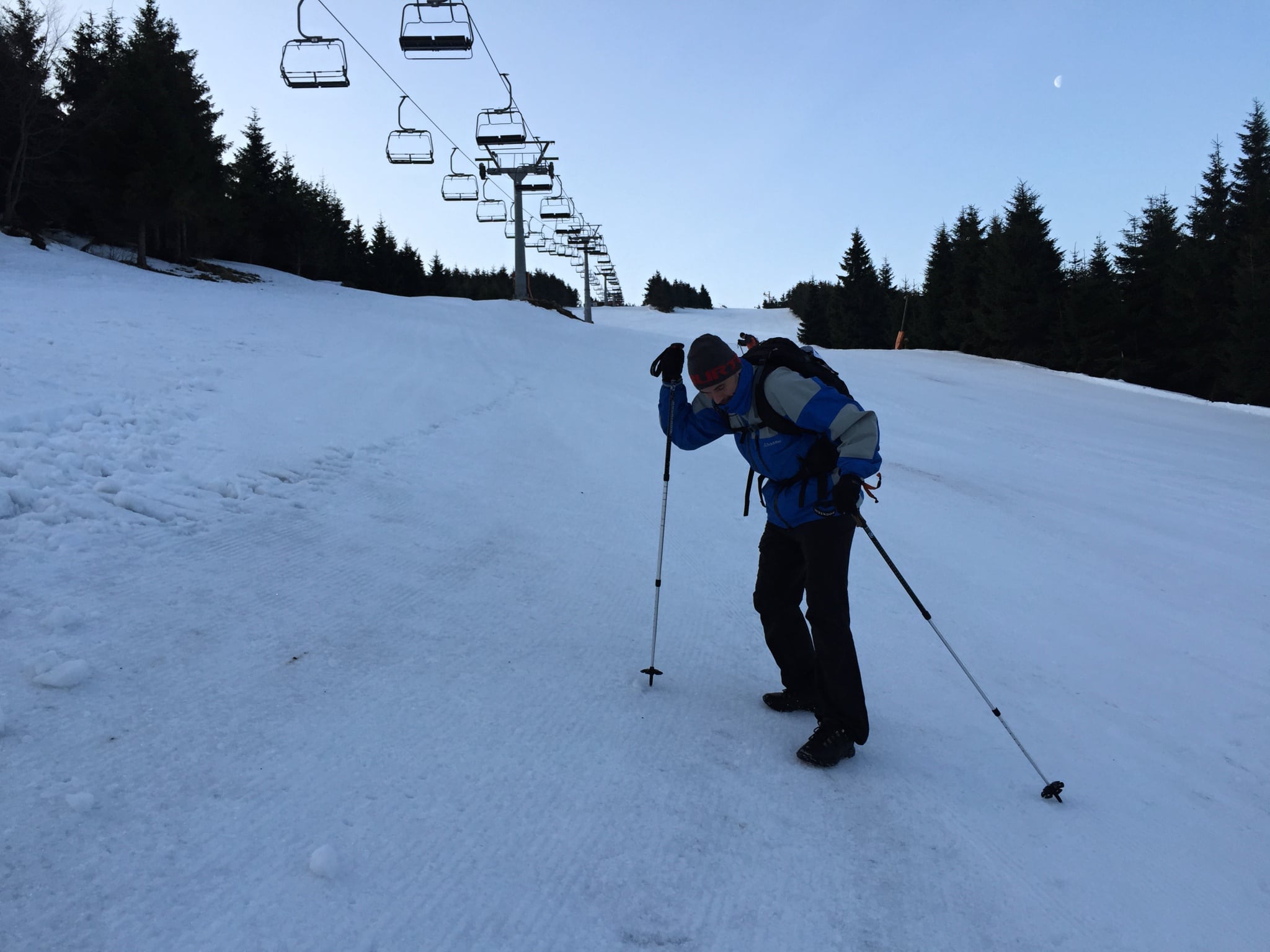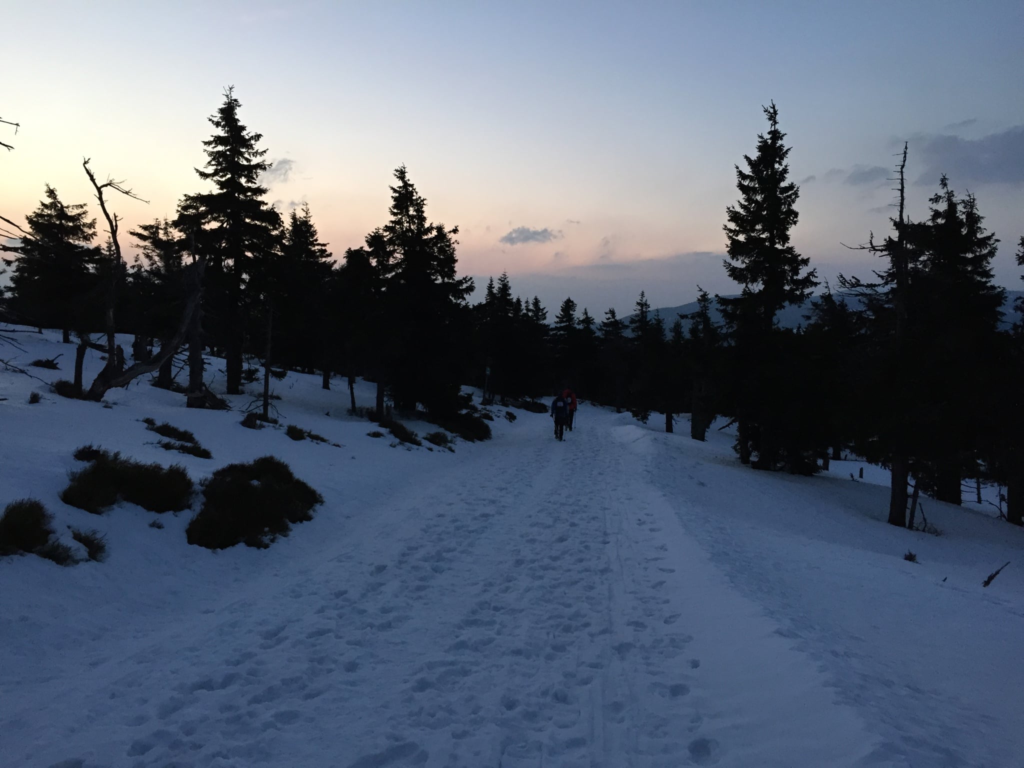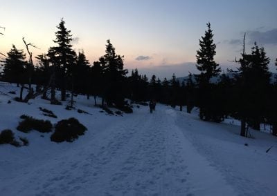 Svítání v Jeseníkách je nádherné. Nebe bez mráčku, mráz příjemně štípe do tváří a kolem dokola téměř nábožné ticho. Kocháme se krásnou přírodou a svižně stoupáme na cestě mezi sjezdovkami. Ranní idylka však končí při křížení jedné z upravených sjezdovek. Na pohled vypadá uhlazený vroubkovaný povrch dokonale, ale má jednu drobnou vadu – klouže jako… no jako led. Já si nasazuji návleky s hroty a bez nejmenších problémů se dostávám na druhou stranu, ale ostatní včetně Kódla takové štěstí nemají. Jak se později dozvídám, byli i tací, kteří jeli po zadku několik stovek metrů. To už není skoro ani k smíchu, ale já se tu teď docela dobře bavím. 🙂 Nakonec to dopadne dobře, Kódl je na druhé straně a můžeme pokračovat na Klínovec.
