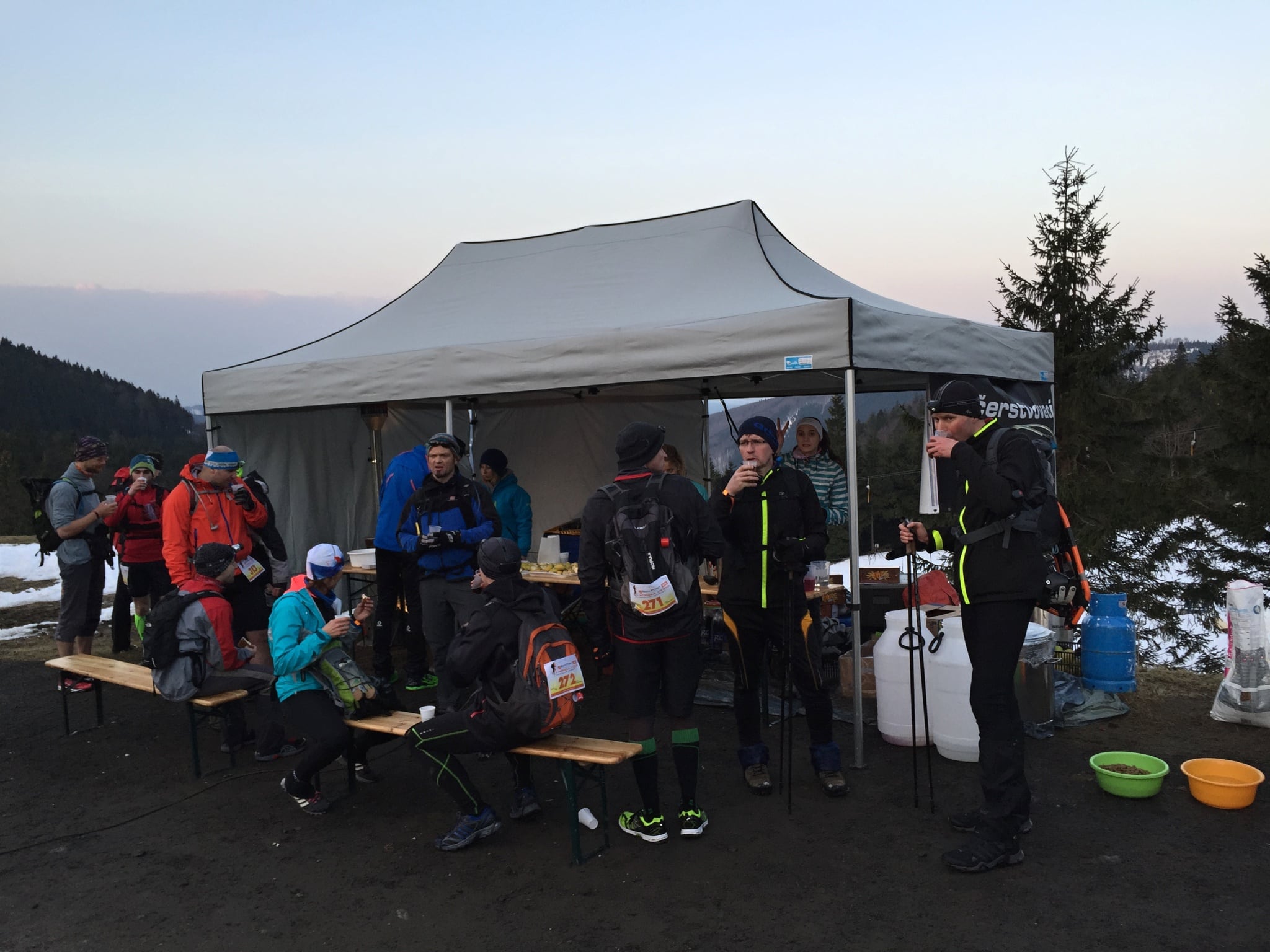 Pro závodníky je k dispozici tradiční menu, tedy rohlíky, salám, koláče, müsli, nějaké ovoce, voda, ionťák a teplý čaj. Je toho spousta a protože mám radost, jak se nám krásně šlape, rozhodně se neodbývám. Především rohlík se salámem je mým oblíbeným duem. Výsledkem je, že když se zase vydáme na cestu a podél Vražedného potoka šplháme nahoru k Obřím skalám a pak ještě dál k Šeráku, je mi naprosto mizerně. Těch 8 kilometrů mi trvá přes 2 hodiny, každou chvilku musím odpočívat, a parťák mezitím někde mrzne… Naštěstí se nakonec na Šerák a poté na Keprník nějak vyškrábu a cestou dolů se moje tělo s ne zrovna vítanou zátěží nakonec úspěšně popere. U Vřesové studánky už je mi hej a když už za světla docházíme k druhé kontrole přímo v Červenohorském sedle, cítím se, jako bych žádné žaludeční nesnáze ani neměl. Ale salámek protentokrát raději vynechám. 🙂
