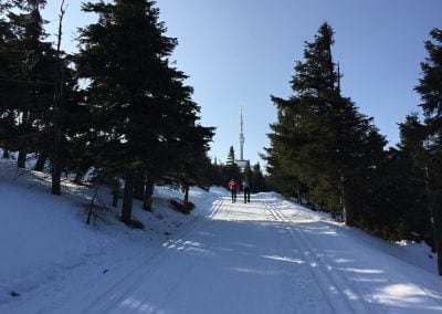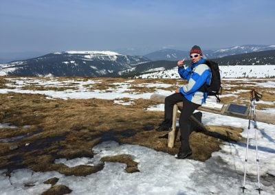 Na Klínovci se pokocháme výhledem, uděláme pár rychlých fotek a jdeme dál. Následující úsek je zdlouhavý a namáhavý, jde se stále do kopce. Sníh se občas boří, občas klouže, ale pořád je ho hodně moc. Přecházíme přes Výrovku, Malý Jezerník a sedlo Velký Jezerník. U chaty Švýcárna se nám otevře výhled na Praděd, na kterém se majestátně tyčí vysoký televizní vysílač. Vypadá na dosah, ale máme to k němu ještě nepříjemné 4 kilometry plné stále rozbředlejšího sněhu. Trvá nám to ještě celou hodinu, ale pak si s úlevou můžeme odpípnout třetí kontrolu (a dojít na záchod).