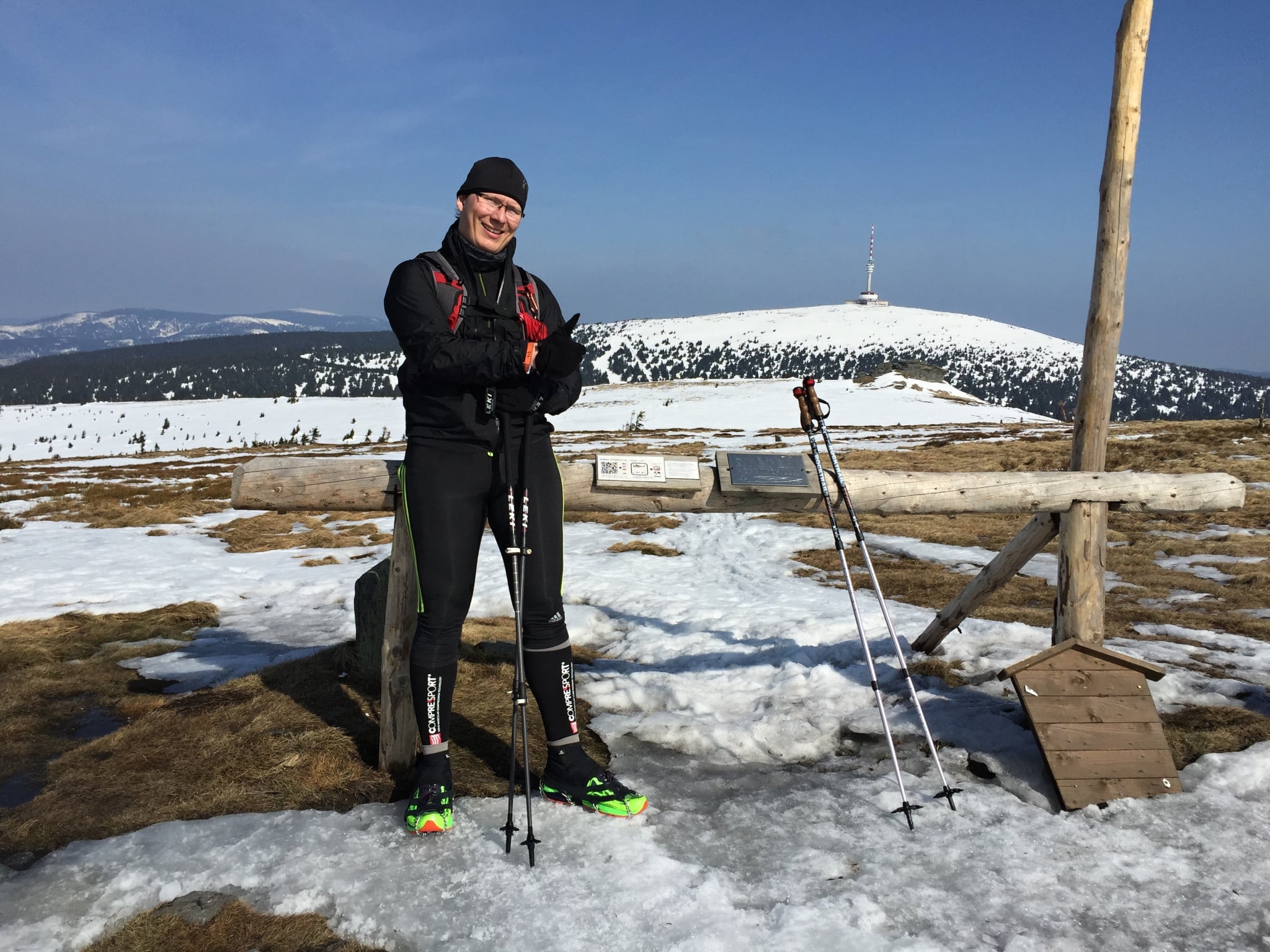Po devadesáti minutách jsme na rozcestí, kde se napojujeme na hřebenovou červenou turistickou značku a pokračujeme na Keprník. Sice to je stále do kopce, ale už ne tak prudkého. Zato tu podle předpokladu dost fouká, takže si raději oblékám větrovku. Na vrcholku Keprníku jsme přesně za 2 hodiny od startu, ale vzhledem k počasí se nezdržujeme a míříme k chatě pod Šerákem. Na rozcestí se dáváme doleva směrem k Ramzové, a protože je to dolů z kopce, skoro celou cestu běžíme. Poslední úsek po sjezdovce je dost náročný, ale zvládneme to bez pádu, proto si za odměnu můžeme dát na první kontrole občerstvení.