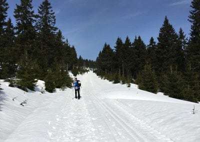 Do cíle to máme ještě asi 10 kilometrů, ale pro nás to budou kilometry nejtěžší. Je poledne, sluníčko nečekaně silně peče a nám došla voda. Chvilku se jí snažím získat ze sněhu, ale pak vzdám marnou snahu a sápu se do kopce s každým krokem víc a víc dehydrován. Průměrná rychlost klesá k nepříjemně nízkým hodnotám a nohy jsou stále těžší a těžší. Z posledních sil obkroužíme Dlouhé stráně, abychom u Borového potoka našli vytouženou studánku. Jak se ukazuje, problém s vodou byl spíš v hlavě, protože si dáme jen pár loků a okamžitě máme sílu zpět. Rychle dojdeme kolem Tetřeví chaty až nahoru na Medvědí horu a před námi je poslední úkol dne, sejít tříkilometrovou sjezdovku.