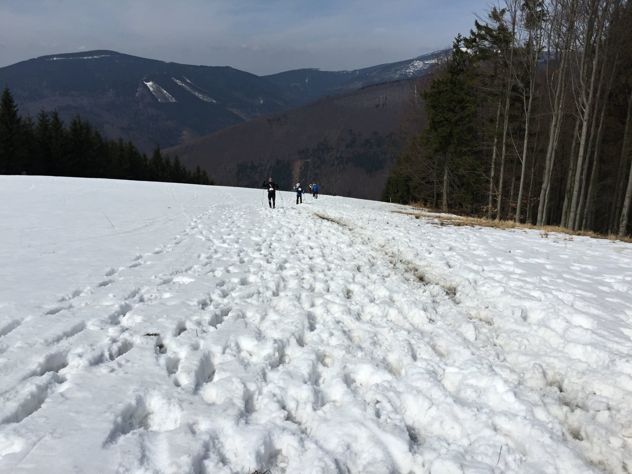 Úvod závodu si dobře pamatuji z předchozího ročníku. On vlastně celý závod v Jeseníkách má asi nejstabilnější trasu. Chvilku se jde po silnici, pak se zahne doprava do lesa a začíná se stoupat. Z počátku pozvolna a po asfaltu, ale pak se ještě jednou odbočí na lesní cestičku a podél potoka Hučivá Desná začíná jít do tuhého. Už proto, že i když je sněhu méně než v roce 2013, dost rychle taje, takže je každých pár metrů větší či menší potok, strouha nebo alespoň louže krytá sněhem, do které s velkým nadšením neustále šlapu. Boty mám skrz na skrz mokré, ale díky ponožkám z Merina to studí jen chvilku, než se voda ohřeje. Ale pak si zase naberu a tak to jde stále dokola…
