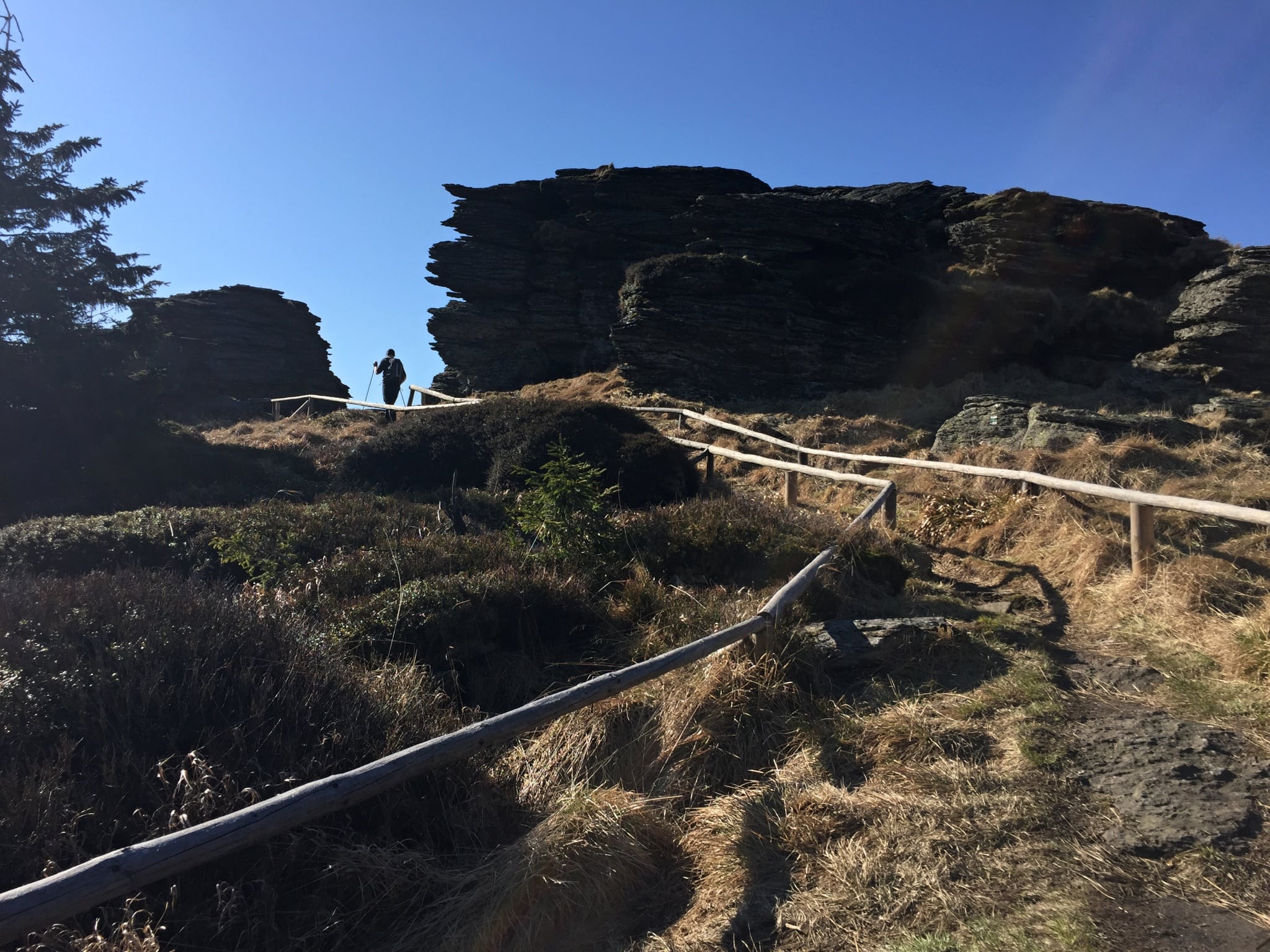 Nahoře na Šeráku mi sluníčko vlije trochu energie, ale jakmile seběhnu dolů do sedla pod Keprníkem, celá situace s náročným terénem se opakuje. A aby toho nebylo málo, po zdolání Keprníku a následném seběhu na Trojmezí následuje odbočka na Vozku. Cesta sama o sobě by nebyla špatná, ale neustálá chůze potůčkem či podmáčeným a bahnitým koridorem dává zabrat nejen nohám, ale i hlavě. U Vozky si za odměnu alespoň fotím celkem fotogenický kus skály, a pak rychle dolů do Sedla pod Vřesovkou. Tedy, rychle, poskakování po kluzkých kamenech a kořenech nikdy nebylo moje a v tomto terénu na nějaký rychlejší pohyb nemám ani pomyšlení.