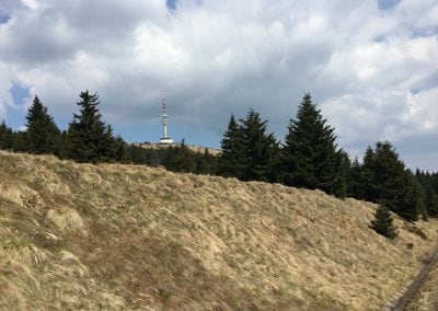 O chvilku později (přesně 48 minut, ten čas je vážně relativní) zvedám své znavené tělo a začínám pozvolné stoupání k Pradědu. Až na vrchol nás naštěstí organizátoři neženou, tak si jen fotím vysílač a spolu s dvojicí kolegů běžím skoro až na Ovčárnu, odkud bez zastavení začínáme šplhat zase nahoru až k Petrovým kamenům. Poprvé a naštěstí naposledy začíná trochu zlobit počasí, sluníčko se na dlouhé minuty schovává za mraky a navíc fouká silný, ledově studený vítr. I do kopce si proto radši beru větrovku a prokousávám se blátem i zbytky sněhu nahoru na kopec. Nahoře není na nějaké kochání se chuť, tak jen rychlé foto a pak dál až na Vysokou holi.