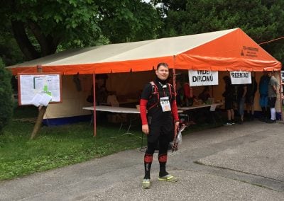 Na Lužické je další kontrola a polévka k tomu. Nějak na ni ale letos nemám chuť, místo toho navštívím WC a cestou zpět potkávám u umyvadla závodníka s krvavým a hodně nateklým kolenem. Další oběť zrádných kamenů… Doplňuji vodu a dobíjím sporttester, proto se celková pauza vyšplhá na 30 minut. Ale krátký odpočinek je nutný, čeká mě neoblíbený trailový sestup k polské Polaně plný kluzkých kamenů, kořenů, bláta a kaluží.