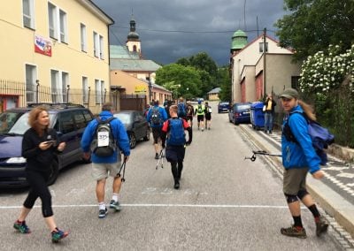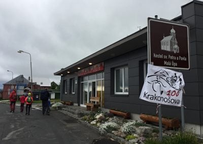 Naštěstí se trasy závodů nakonec dělí a my scházíme do poslední vesnice před Vrchlabím, do Horního Lánova. Vylézt na poslední kopec a pak po asfaltce dojít až k městskému parku nám zabere asi 45 minut a pak už nás čeká jen mírný sestup do města. Cestou nás začínají dobíhat první závodníci poloviční, 55 kilometrů dlouhé trasy, tak je radostně zdravíme a těšíme se na cílovou pásku. Poslední metry Vrchlabím už vnímáme jak ve snu a konečně je tu cíl. Jsme tu, zvládli jsme to!