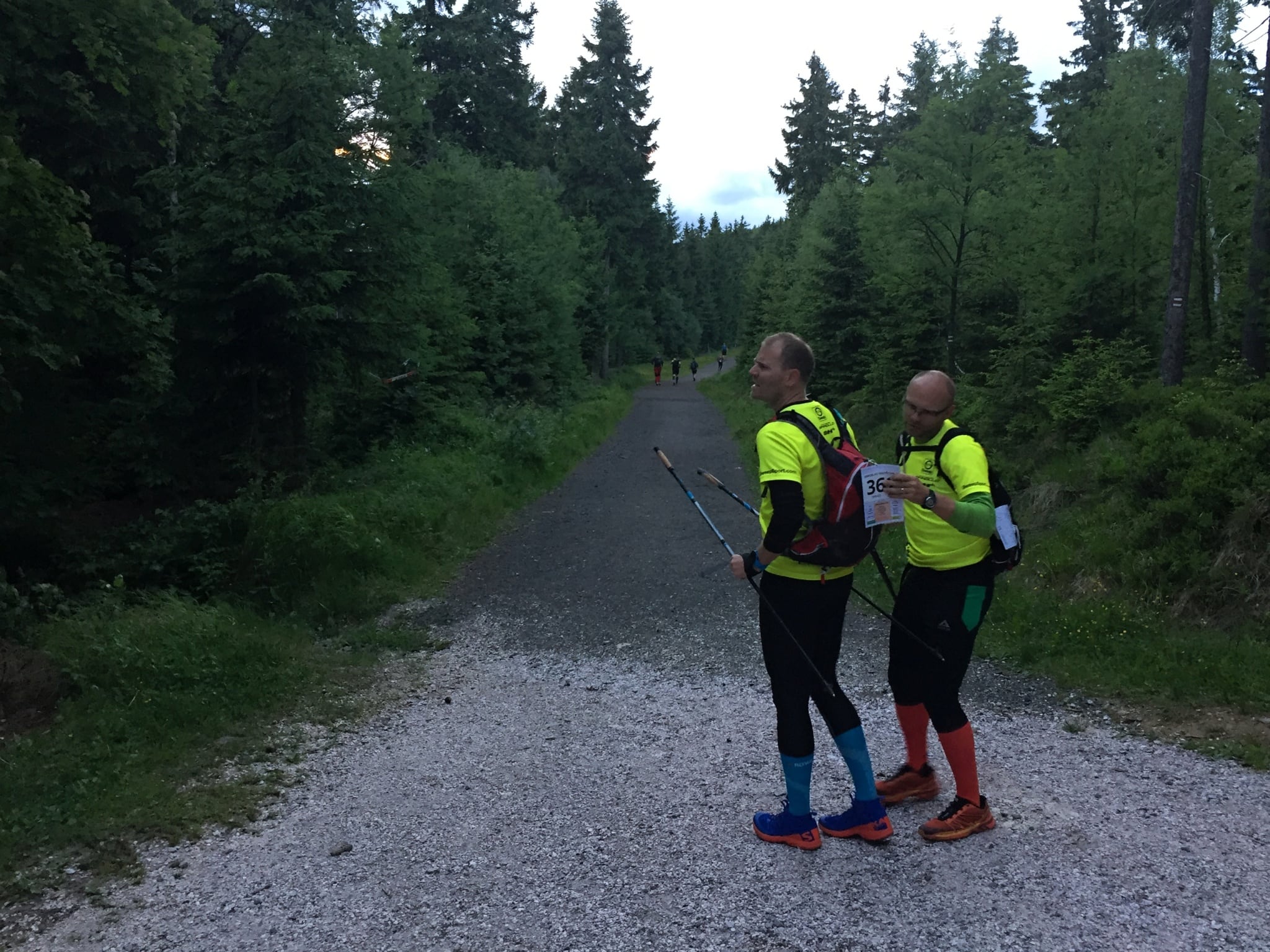 Když pominu velmi prudký sestup po nepohodlné cestě v první části cesty na Pomezní boudy, dál už je to naopak příjemná procházka. Bohužel, můj plán trochu to v poslední třetině závodu rozbalit a nahnat nějaké ty hodiny se začíná rozplývat. Prostě mi odešly nohy, sílu mám, ale do stehen a lýtek ji nějak neumím dostat. Takže se do kopců ploužím a z kopců běžet nemůžu, protože nohy bolí a bolí… Ale nějak zásadně mě to nenervuju. Když to jde, snažím se o svižnou chůzi a alespoň nemusím každou chvíli odpočívat a chytat dech.
