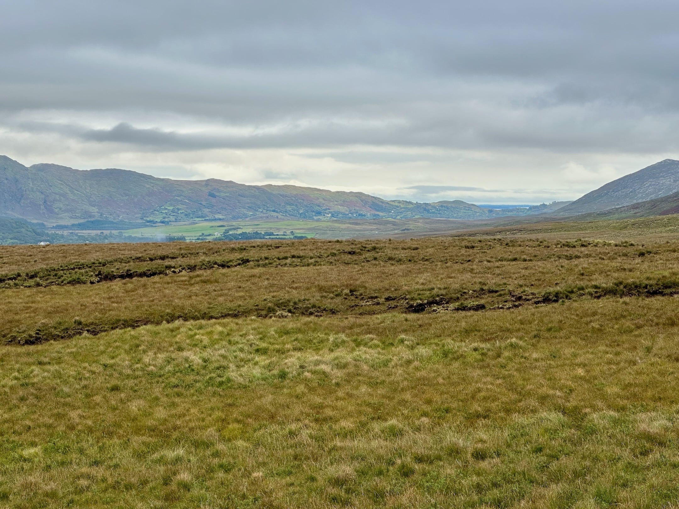 Prvních pár kilometrů vede městečkem. Hned na úvod řeším navigační hádanku, ukazatel se žlutým panáčkem ukazuje jinam, než mě vede GPSka v hodinkách. Po krátkém váhání se rozhodnu důvěřovat spíš hodinkám a o pár minut později mě další značka utvrdí v tom, že jsem si vybral správnou cestu. Jinak se příroda odkrývá postupně. Míjím ve vřesovišti ukryté fotbalové centrum s několika fotbalovými hřišti, kochám se každou další farmou s ovečkami, kravičkami, koníčky, občas potkám jedince či dvojici na procházce. Pomalinku stoupám a občas se mi naskytne i výhled na jezero Coirib ztrácející se v nízké oblačnosti.