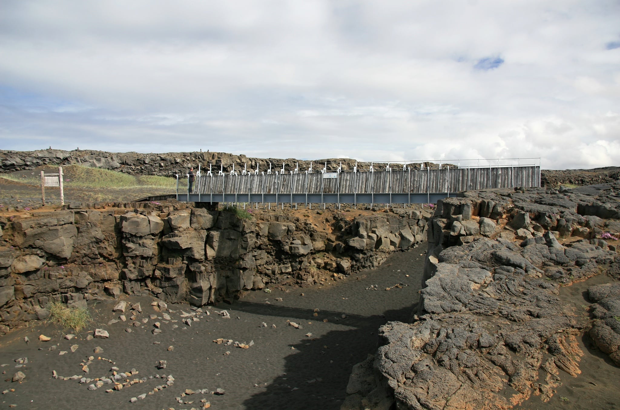 Druhou zastávkou na naší cestě bude „most mezi kontinenty“ v Sandvíku, což je pár kilometrů od vesnice Hafnir. Když v půl dvanácté dorážíme na místo, nevypadá to z parkoviště na první pohled nijak výjimečně. Všude kolem stará láva, čas od času nějaká malá rostlinka nebo trs trávy. Po sto metrech přicházíme k mostu, který překlenuje mělkou, jen několik metrů hlubokou průrvu. Pořád nic extra. Až z průvodce a z nedaleko stojící tabule se dozvídáme, že mostek ve skutečnosti překlenuje pevninský zlom rozdělující euroasijskou a severoamerickou pevninskou desku, které se od sebe navíc oddalují z geologického hlediska obrovskou rychlostí přes 2 cm za rok. Tento zlom vede skrz celý Island, ale na tomto místě patří k lépe patrným. Nepřehlédnutelná je ovšem činnost sopek ležících přímo na zlomu, mimo jiné tam je Krafla, Askja, Katla i nedávno k životu probuzený vulkán Eyjafjallajökull.