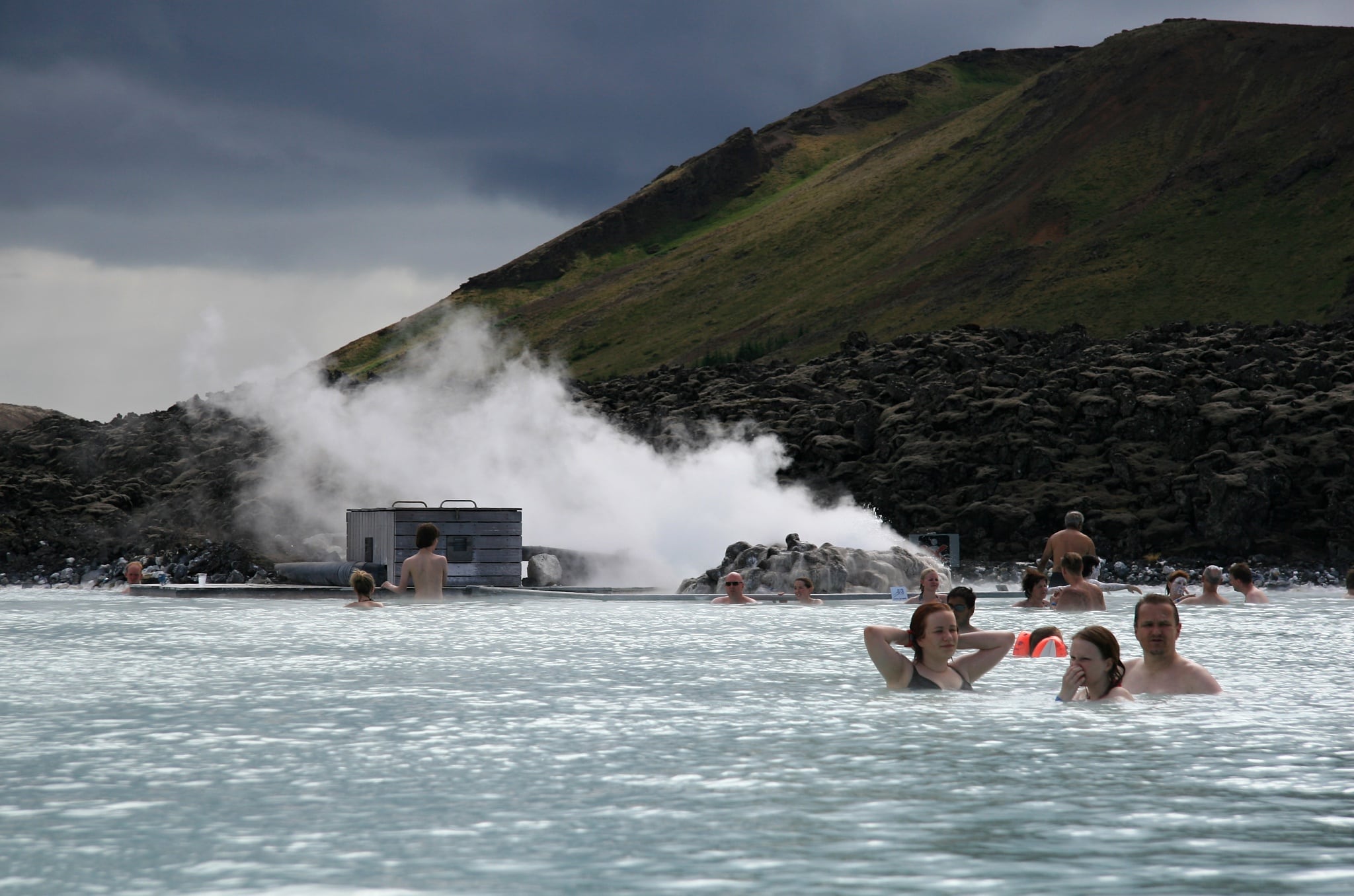 Přes silného ducha místa toho ale není moc k vidění, tak po chvilce focení a popocházení po mostku tam a zpátky nasedáme do auta a míříme k poslednímu bodu našeho itineráře, k přírodním lázním Modrá laguna (v islandštině Bláa lónið). Lehce pikantní je skutečnost, že voda v lázních je ve skutečnosti odpadní voda vypuštěná z geotermální elektrárny Svartsengi stojící nedaleko. Vodní plocha vznikla samovolně v roce 1976, od roku 1981 byla známa jako místo pro koupání s léčivými účinky, a teprve v roce 1992 se kolem přírodního koupaliště začaly formovat lázně v pravém slova smyslu. Díky silnému průtoku se celá voda v lázních vymění každé dva dny. Teplota vody v lázních se pohybuje mez 37 a 39 stupni Celsia a zvláštní mléčné modro-zelené zbarvení vody má na svědomí silná koncentrace rozpuštěných křemičitých a sirných minerálů.