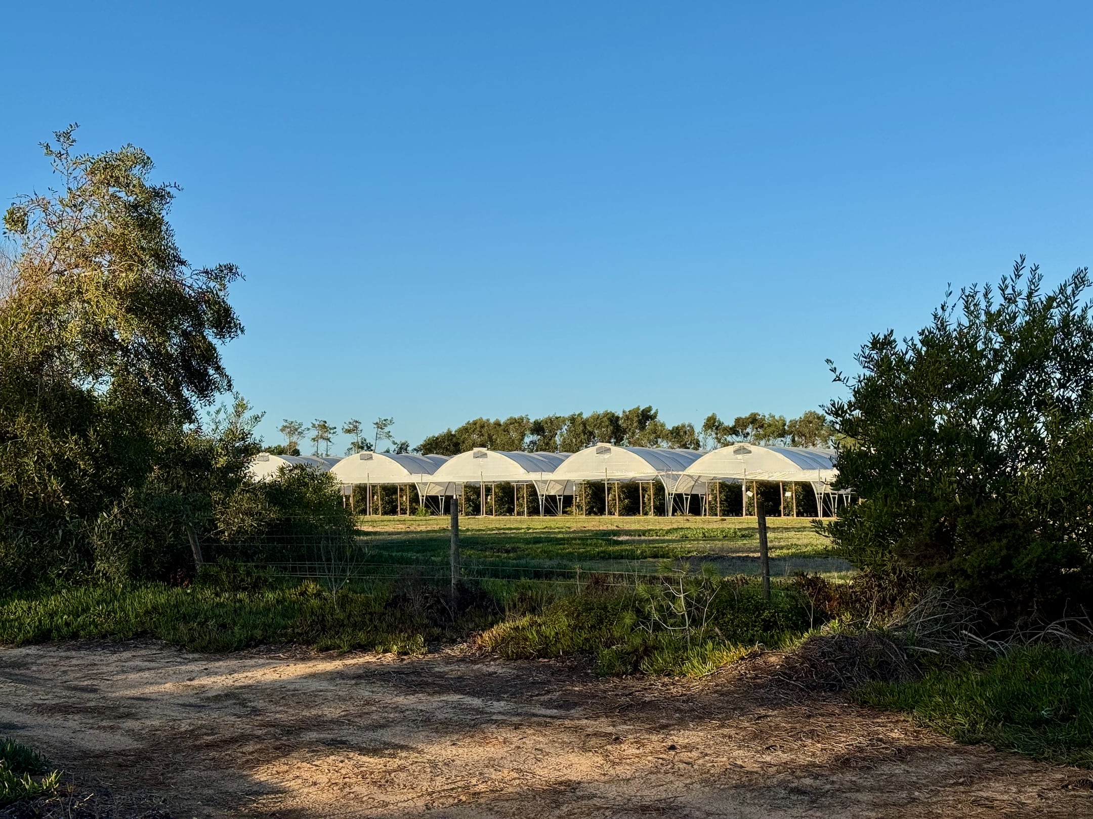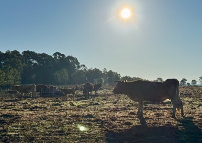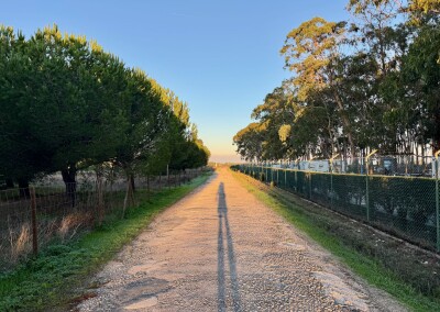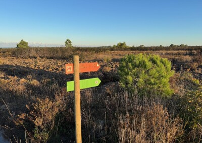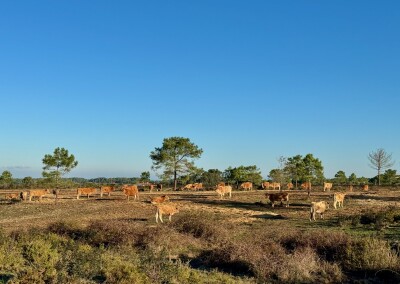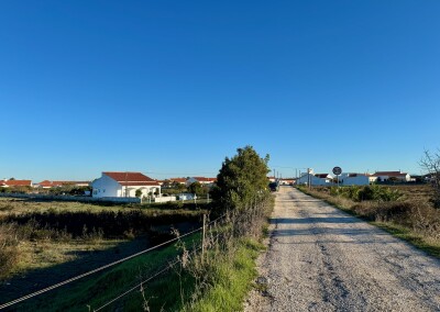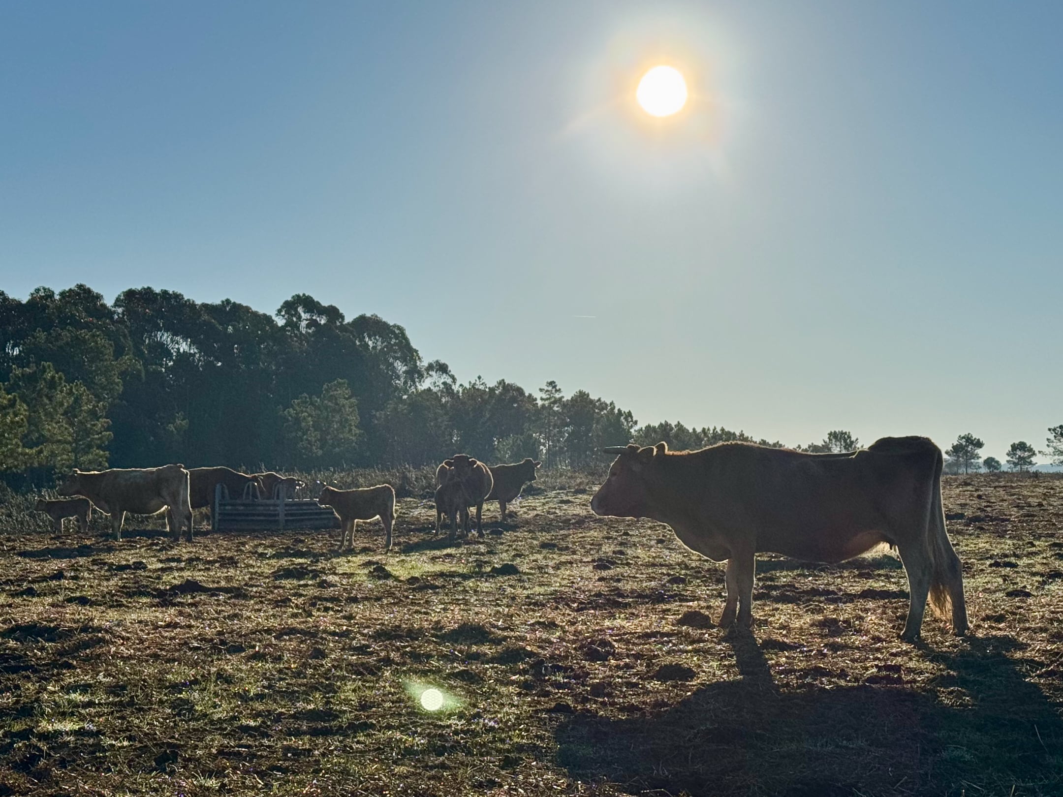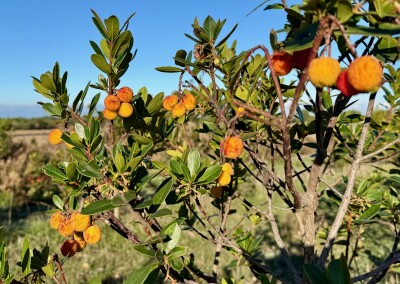 Nebe je bez mráčku, sluníčko svítí a hřeje, ale zatím jen málo. Zima mi je pořád. Mám sice mikinu, ale kraťasy a sandály mě moc nezahřejí, ruce držící hůlky mi vysloveně mrznou. Chvilku zvažuji dát si do sandálů ponožky, ale nevím, jestli je na takové módní kreace Portugalsko dostatečně odolné. Nakonec se rozhodnu jen zrychlit a doufám, že sluníčko brzy nabere na síle. Cestou potkávám stáda krav a občas i nízký strom s oranžovými až červenými plody. Dle AI je to jahodovník, plody jsou jedné, ale takhle syrové nic moc, používají se především do marmelád nebo likérů.