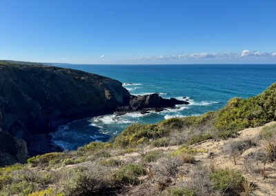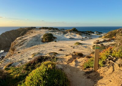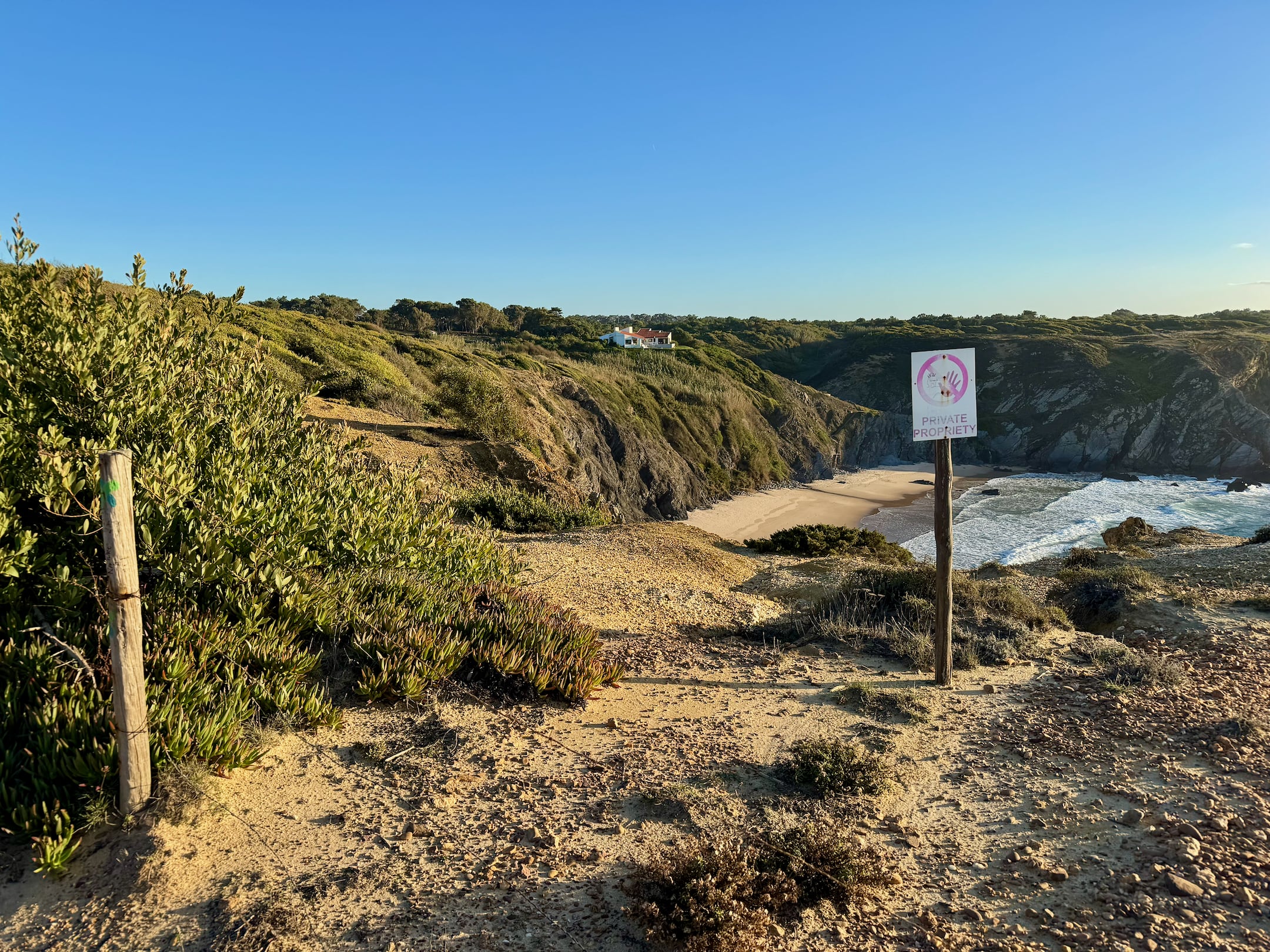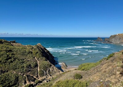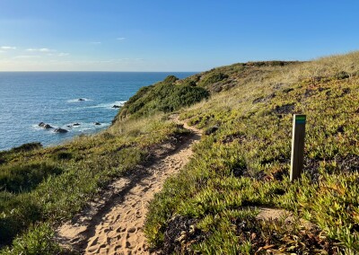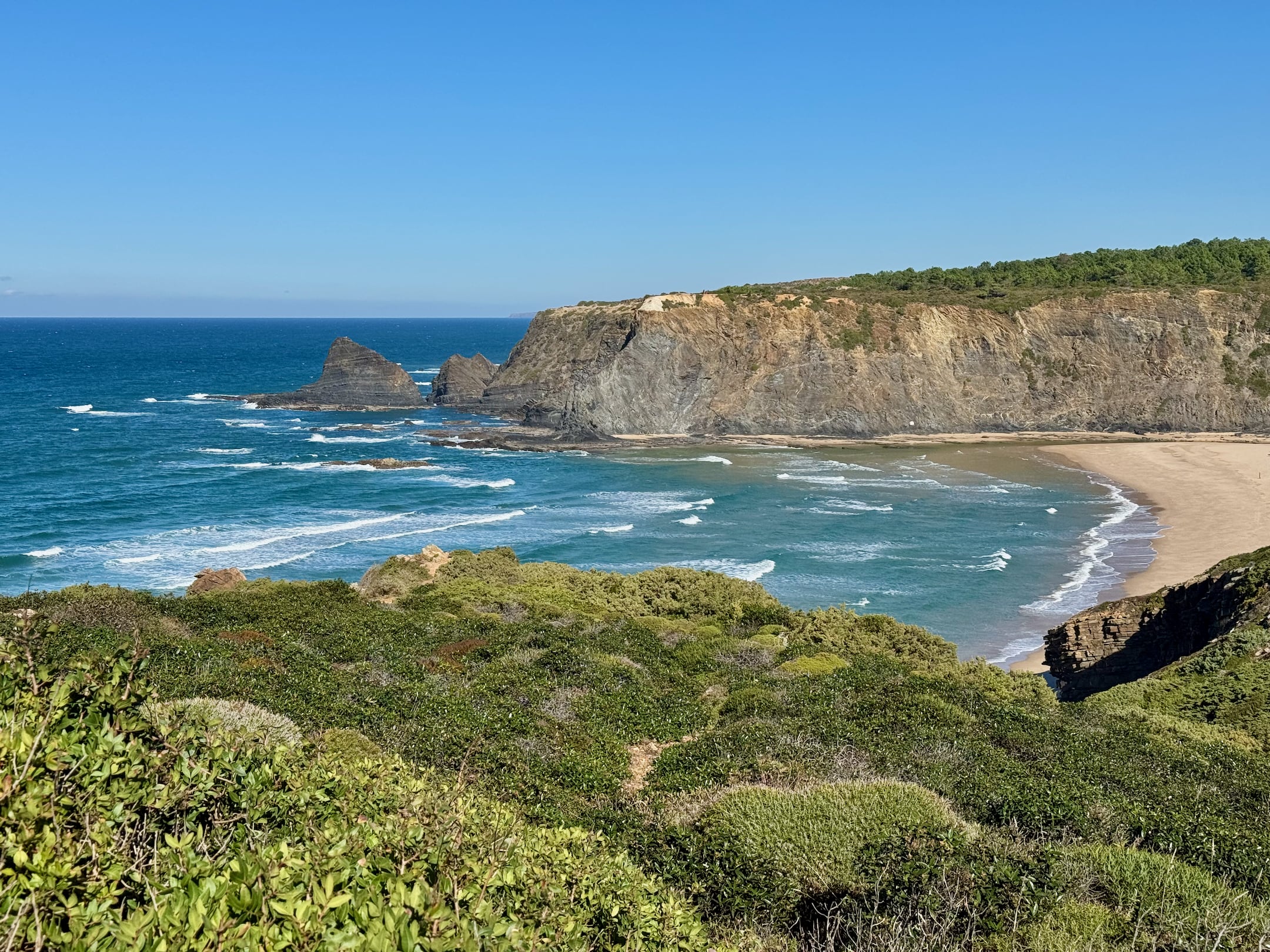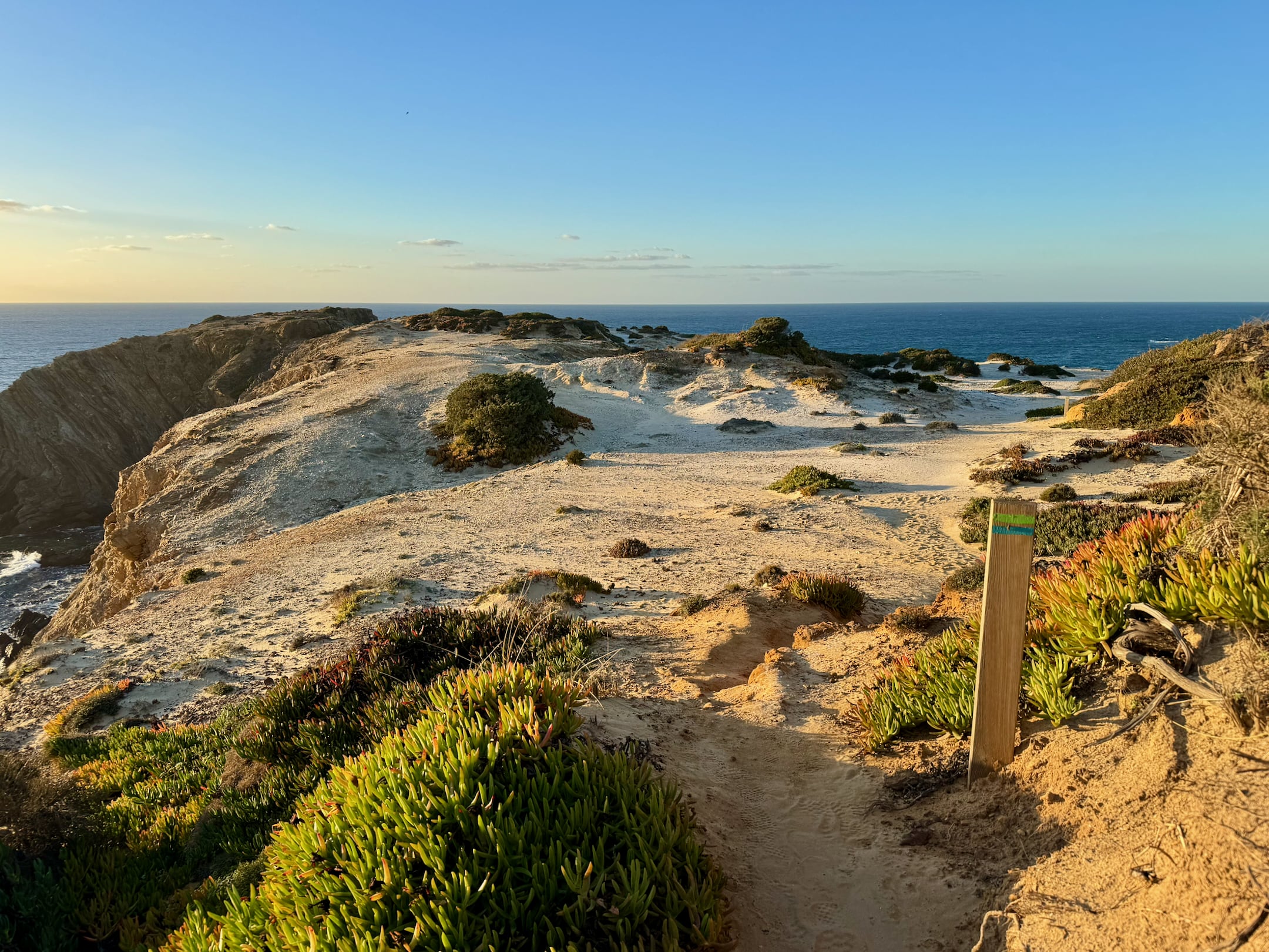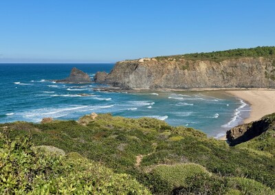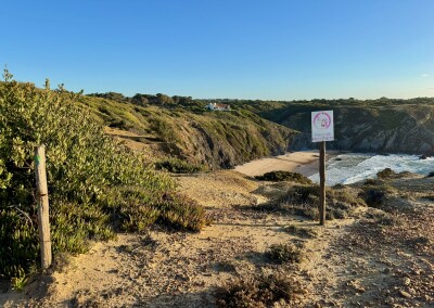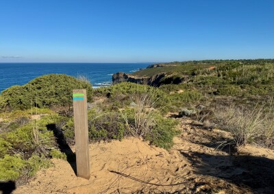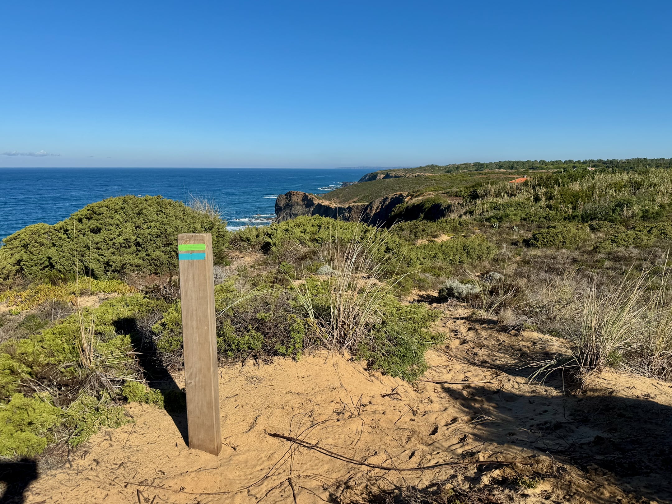 Úsek do další rekreační osady Azenha do Mar nabízí zase to nejlepší z treku. Písek, ušlapaný i hluboký, skály, kameny, keře, moře a pláže. Je to sice dost na jedno brdo, ale po dnešních kilometrech po asfaltu si horký písek mezi prsty alespoň na chvíli nechám líbit. Občas potkám nějakého hikera, ale jinak jdu sám a poslouchám jen moře a přírodu.