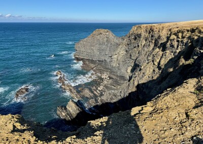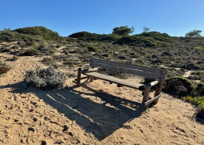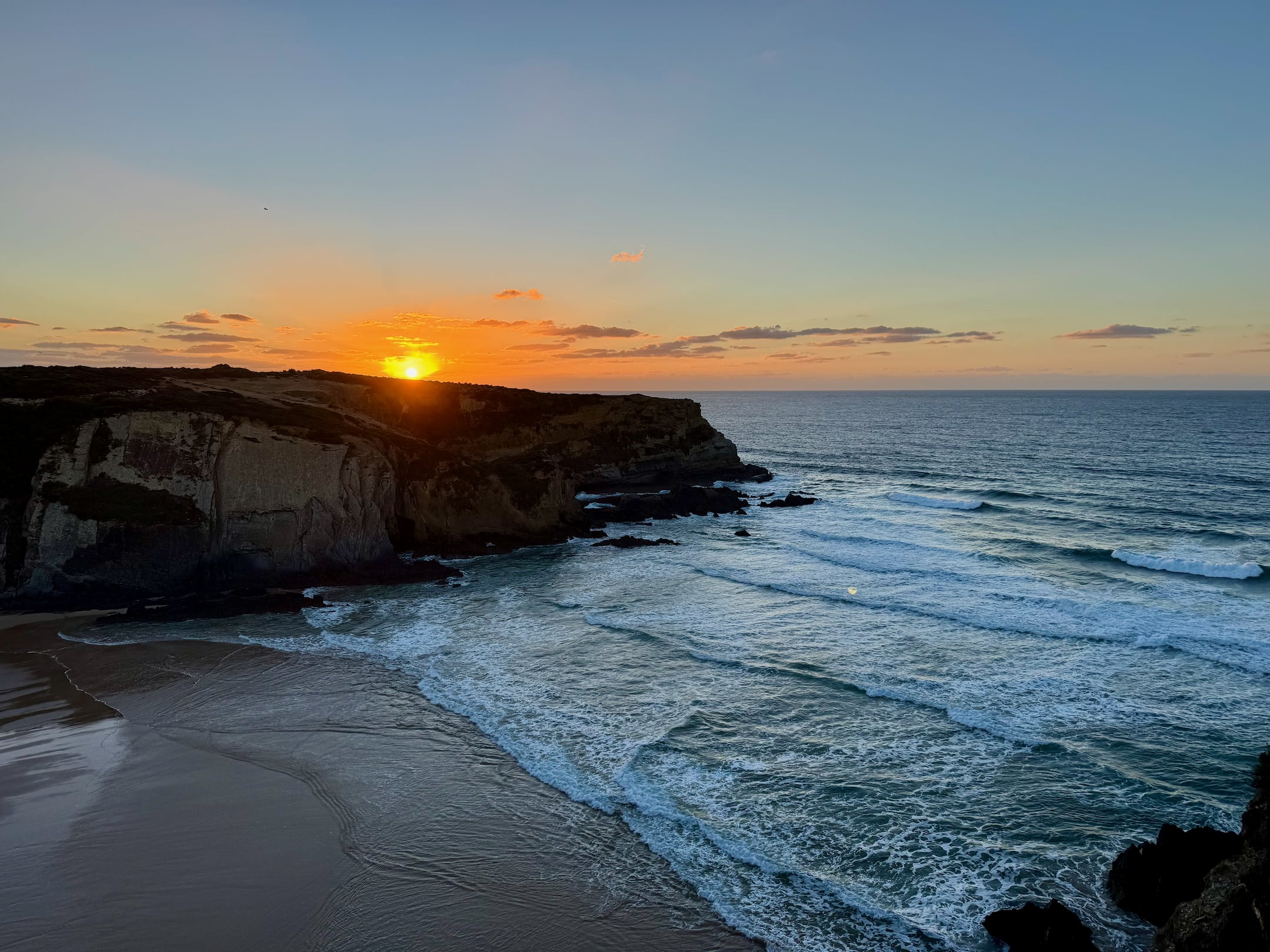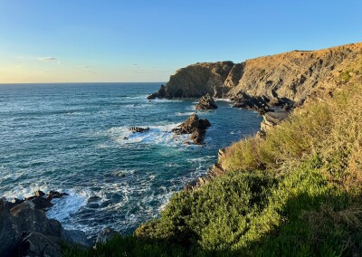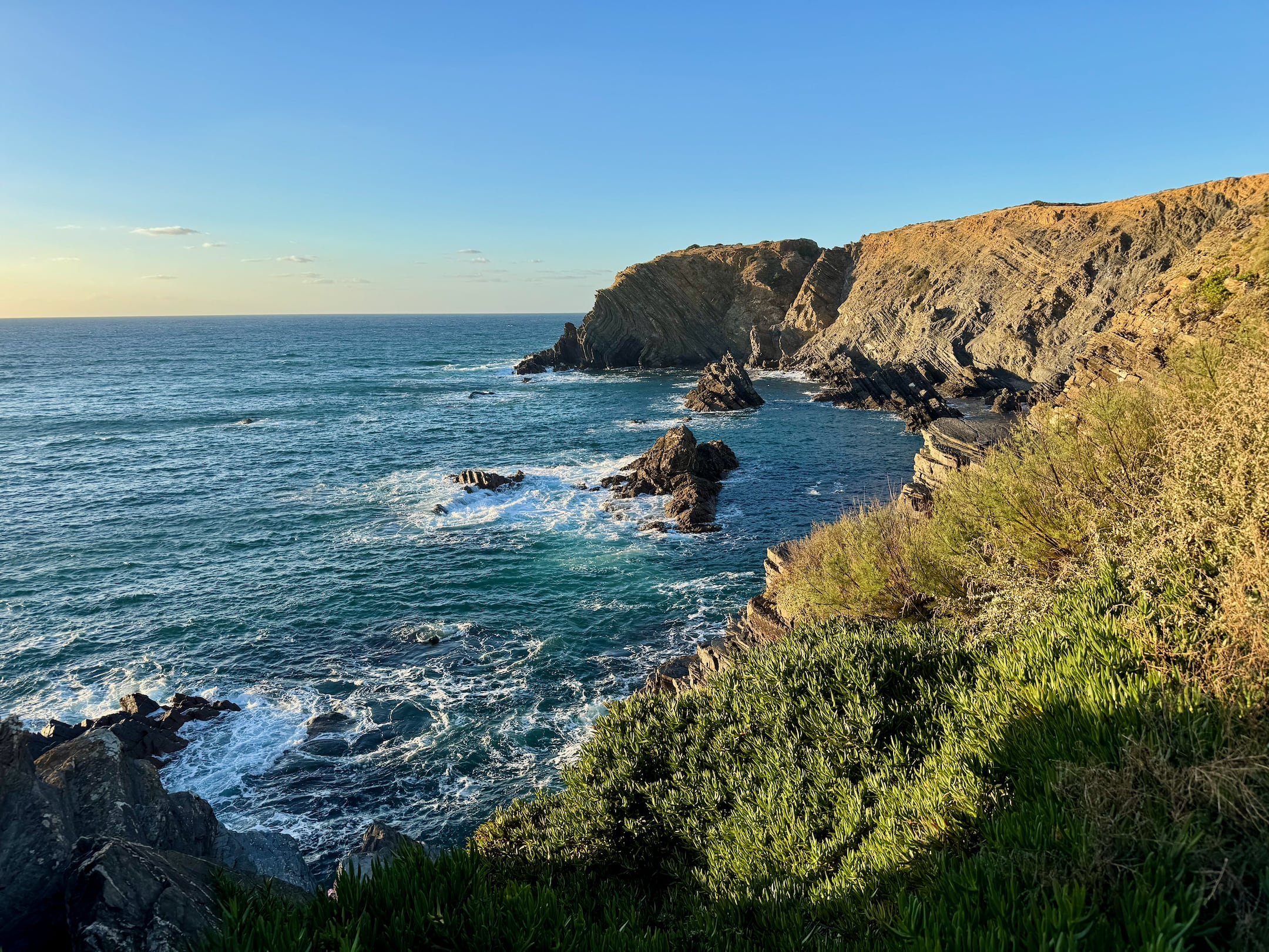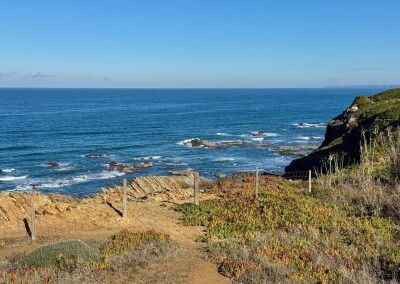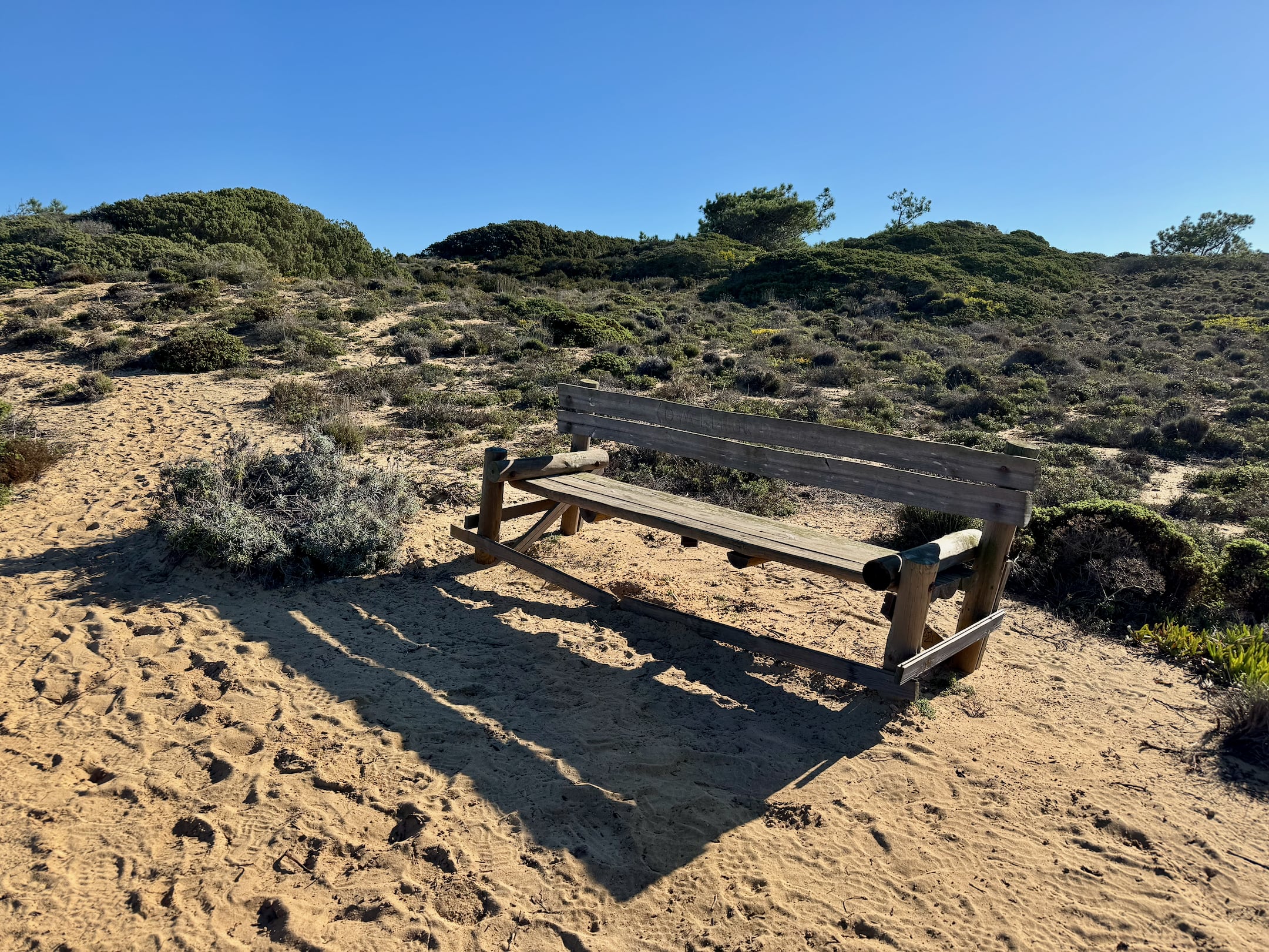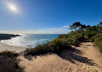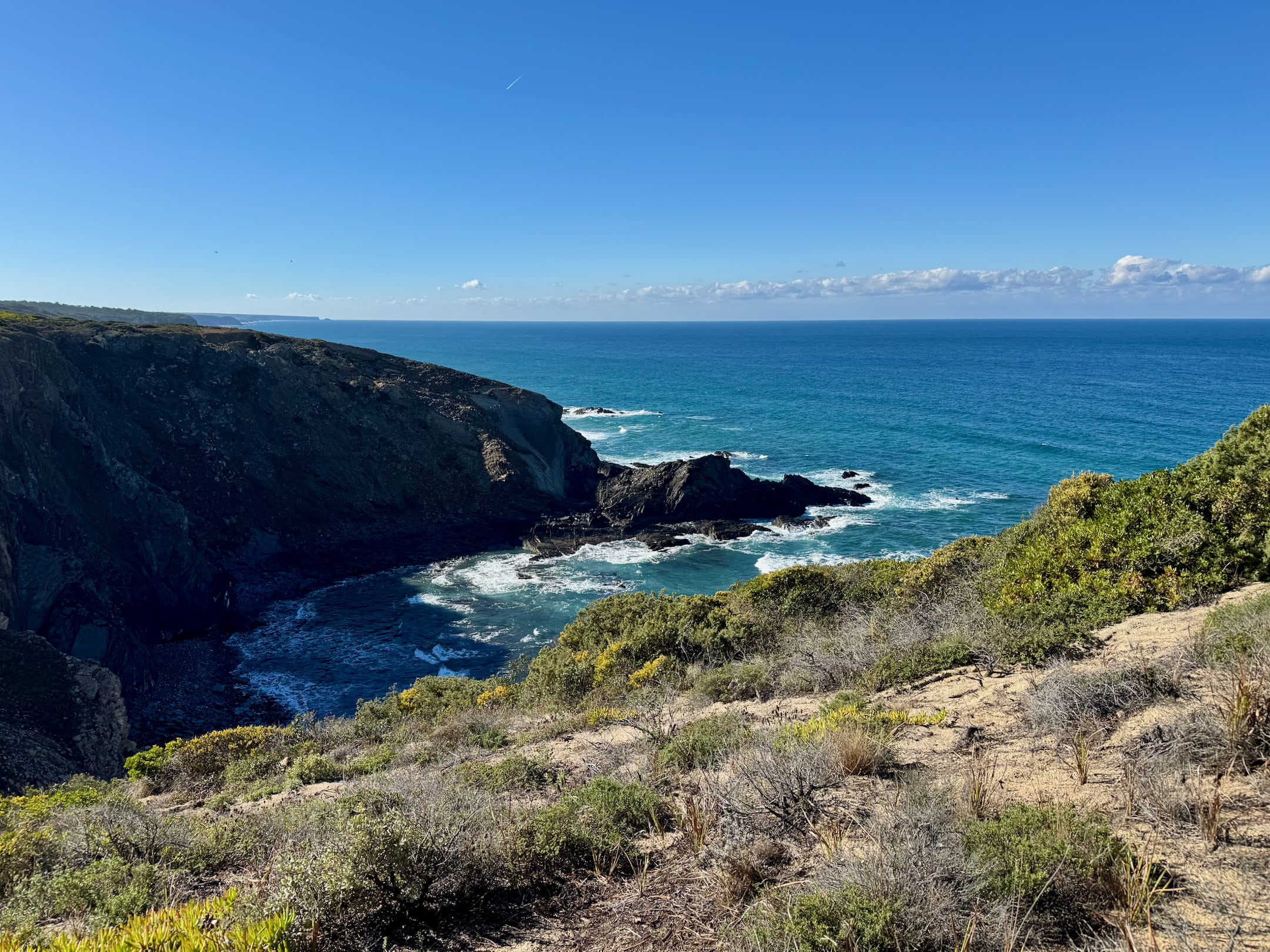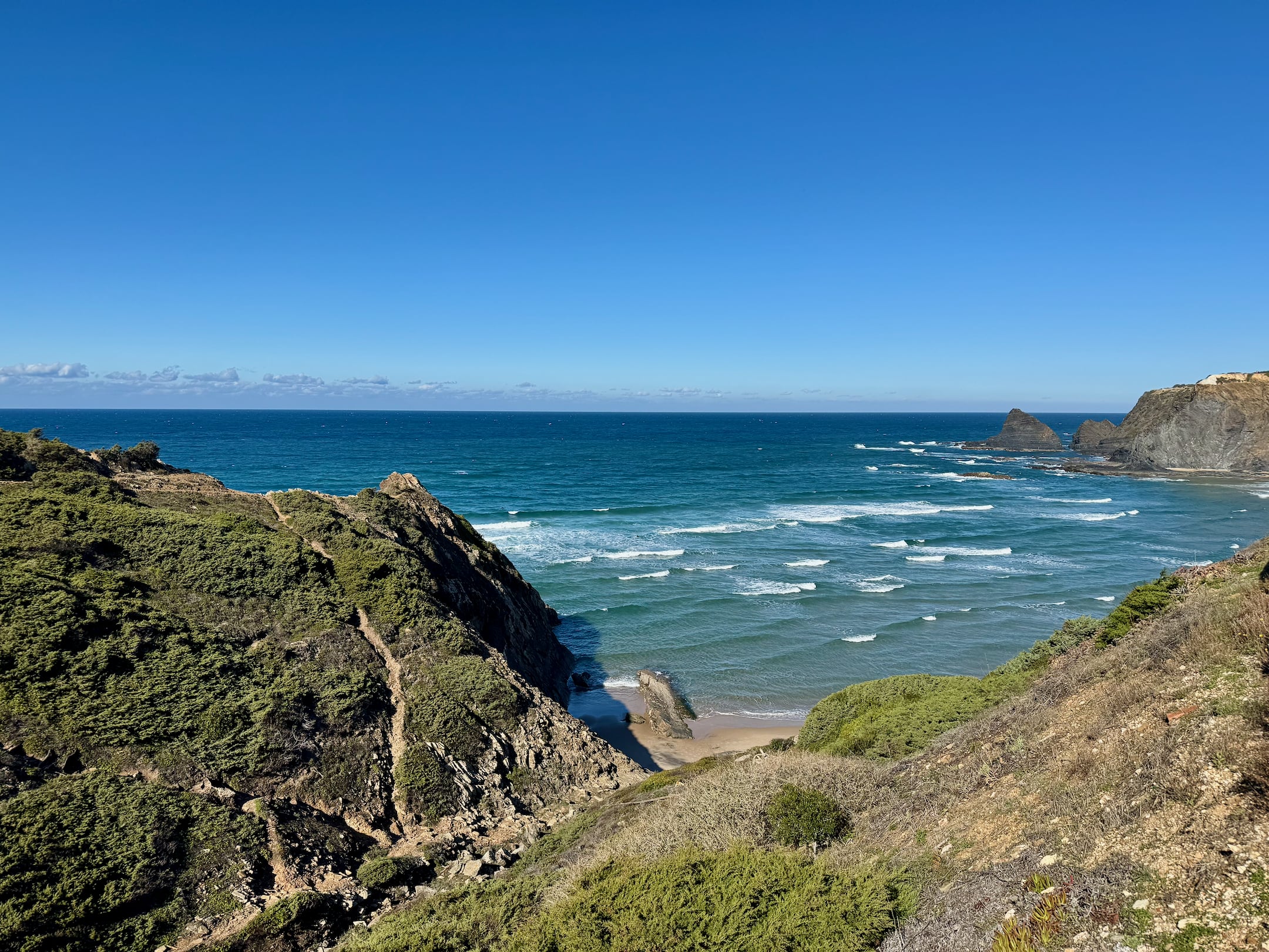 Úsek do další rekreační osady Azenha do Mar nabízí zase to nejlepší z treku. Písek, ušlapaný i hluboký, skály, kameny, keře, moře a pláže. Je to sice dost na jedno brdo, ale po dnešních kilometrech po asfaltu si horký písek mezi prsty alespoň na chvíli nechám líbit. Občas potkám nějakého hikera, ale jinak jdu sám a poslouchám jen moře a přírodu.