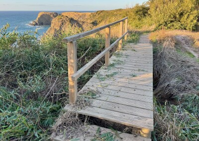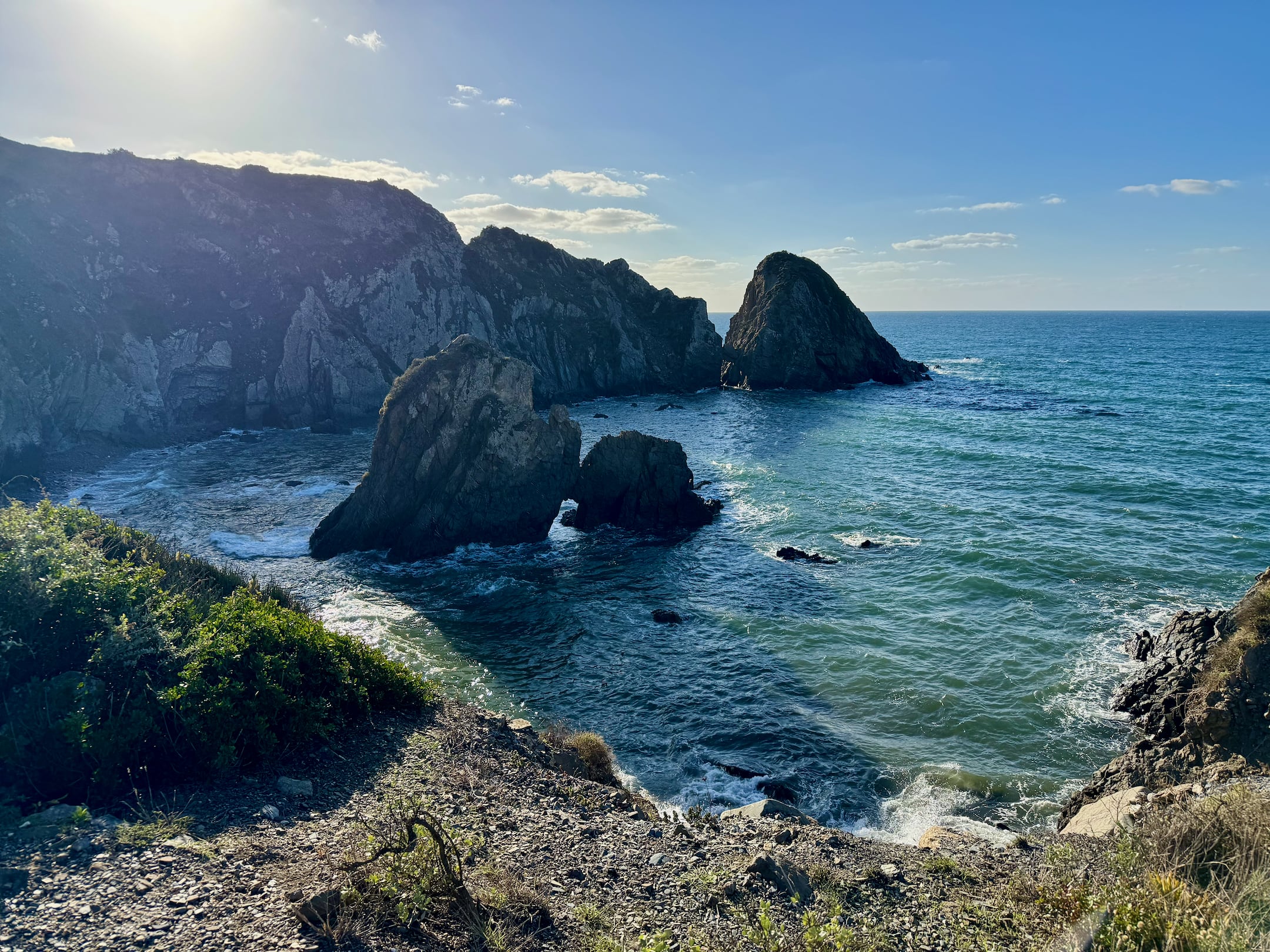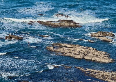 Po více jak dvou hodinách ťapání jsem zase u moře. Zaujme mě rybář, který na skále v příboji loví ryby. Přijde mi to celkem odvážné, ale na to sledovat, jak to dopadne, nemám čas. Značka mě totiž po pár stech metrech na útesu vede zase do vnitrozemí. Na okružní cestě si ze silnice prohlížím další farmy, sady a vinice. V tomhle počasí se musí rostlinám dařit jedna radost!