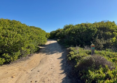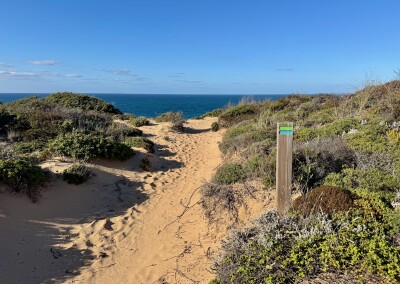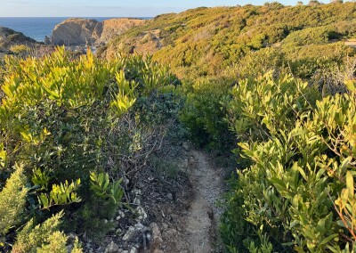 Na pár kilometrů se vracím na pobřeží. Čeká mě písek, skály, nízké keře a bouřící moře. To ani dneska není úplně klidné, vlny mají vesměs tak 1-2 metry. Dneska tomu ale odpovídá vítr, u moře silně fučí. Sluníčko už zase připaluje, ranní mrzutí je dávno pryč. Cestou potkávám každých pár minut nějakého turistu nebo hikera s batohem. Je tu hodně sólo holek, v poměru ke klukům tak 1:4.