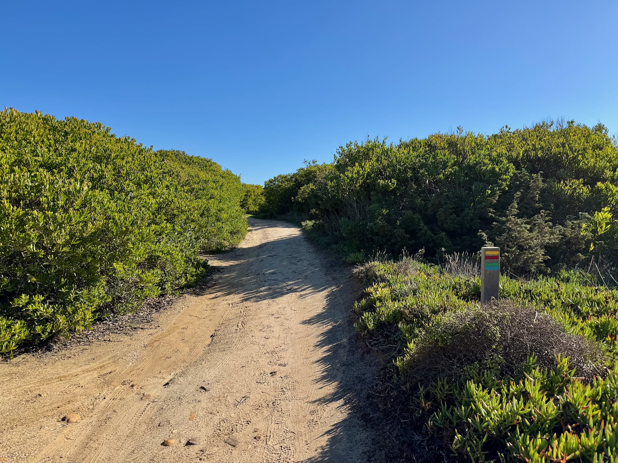 Noc v kempu byla klidná, myslím, že jsem celou doby slyšel příboj. Nad ránem se do mě dala trochu zima. Spal jsem ve spacáku jen nalehko a na ranních 8 nebo 7, možná jen 6 stupňů, to bylo už málo. Rozhodl jsem se proto zahřát balením a v půl osmé jsem připraven na cestu. Vracím těžké číslo pro označení stanu na recepci a po ušlapané cestě vyrážím na západ směrem k moři.