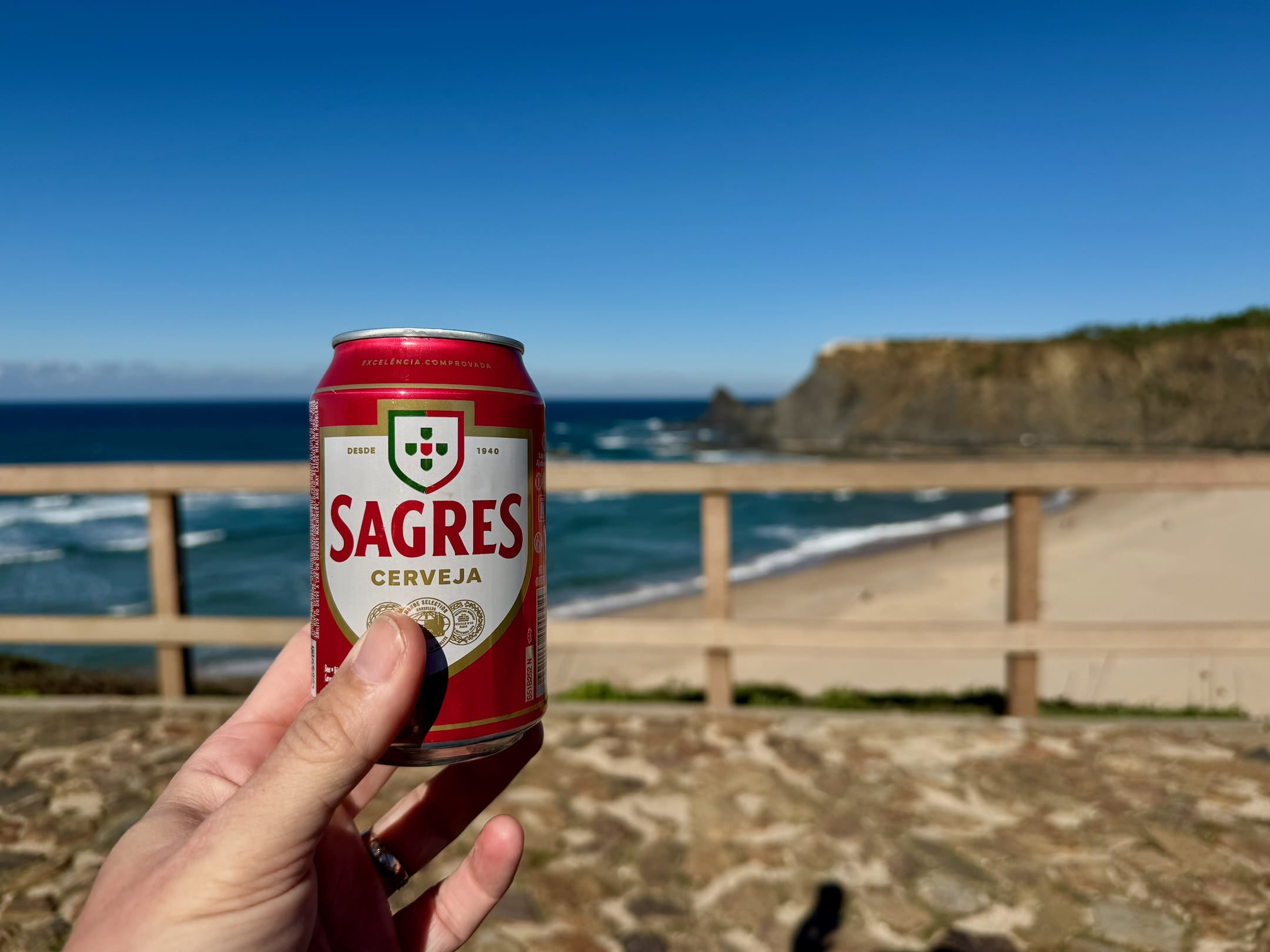 Přicházím do malého rekreačního střediska Praia de Odeceixe. Jak sám název napovídá, hlavním lákadlem je tu obrovská písečná pláž u ústí řeky Seixe. Docela bych si dal kafe, ale jako na potvoru je jediná otevřená kavárna ve stínu a na větru, takže tam lidi sedí v bundách. Tak kafe oželím a místo toho si na lavičce na sluníčku otevřu plechovku piva.
