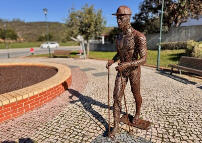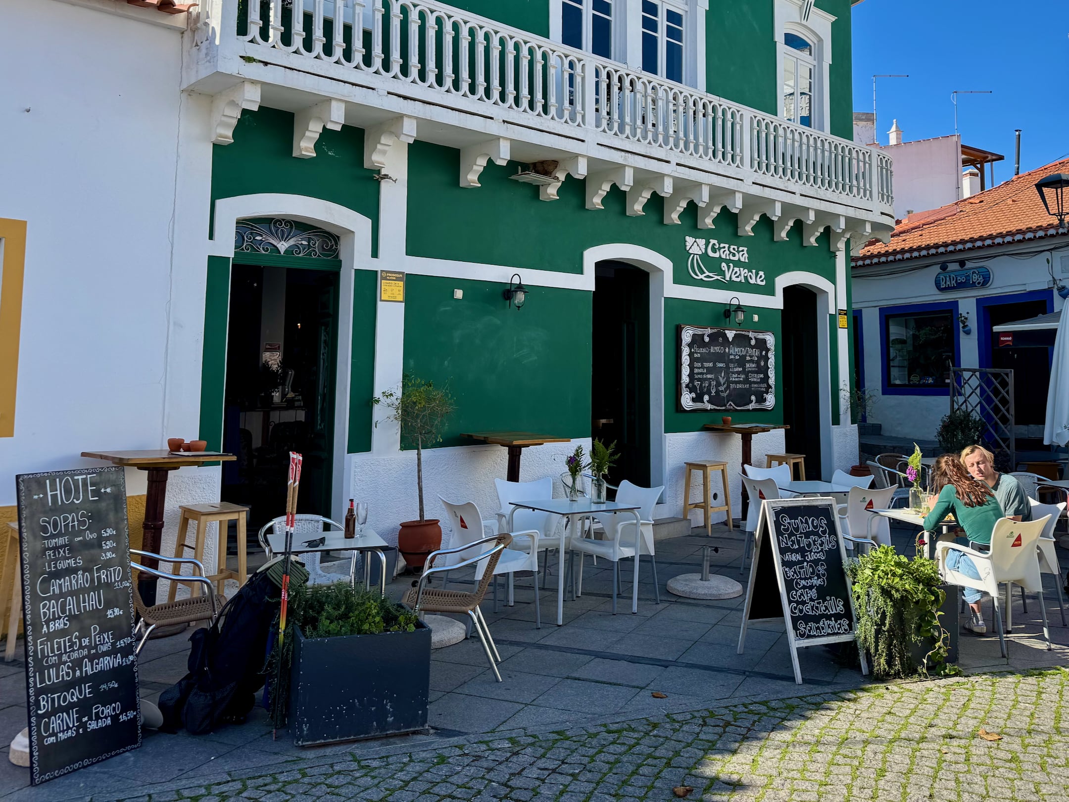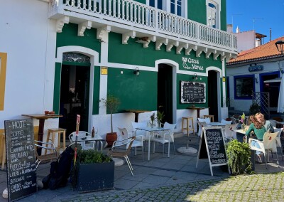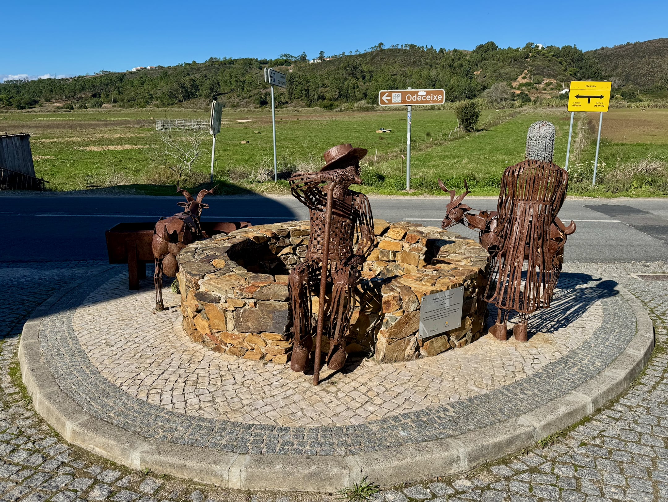Do městečka Odeceixe je to něco přes 3 kilometry. Sice z mírného kopce, ale zato skoro pořád po hodně frekventované, ale nepříjemně úzké silnici. Míjí mě nejen nespočet aut, ale i autobusy a velké kamiony. Což spolu s tím, že tu je i hodně pěších po obou stranách silnice, není úplně komfortní. Naštěstí vše proběhne bez problémů a po několika kochacích výhledech na meandry a písečné pláže řeky Seixe a krátkém zastavení u kovových skulptur na okraji městečka přicházím na jedno z místních náměstí, kde je i několik otevřených restaurací. Chvilku bádám nad tím, kam se usadím, nakonec zvolím zelený dům Casa Verde. Dal bych si nějakou rybu…