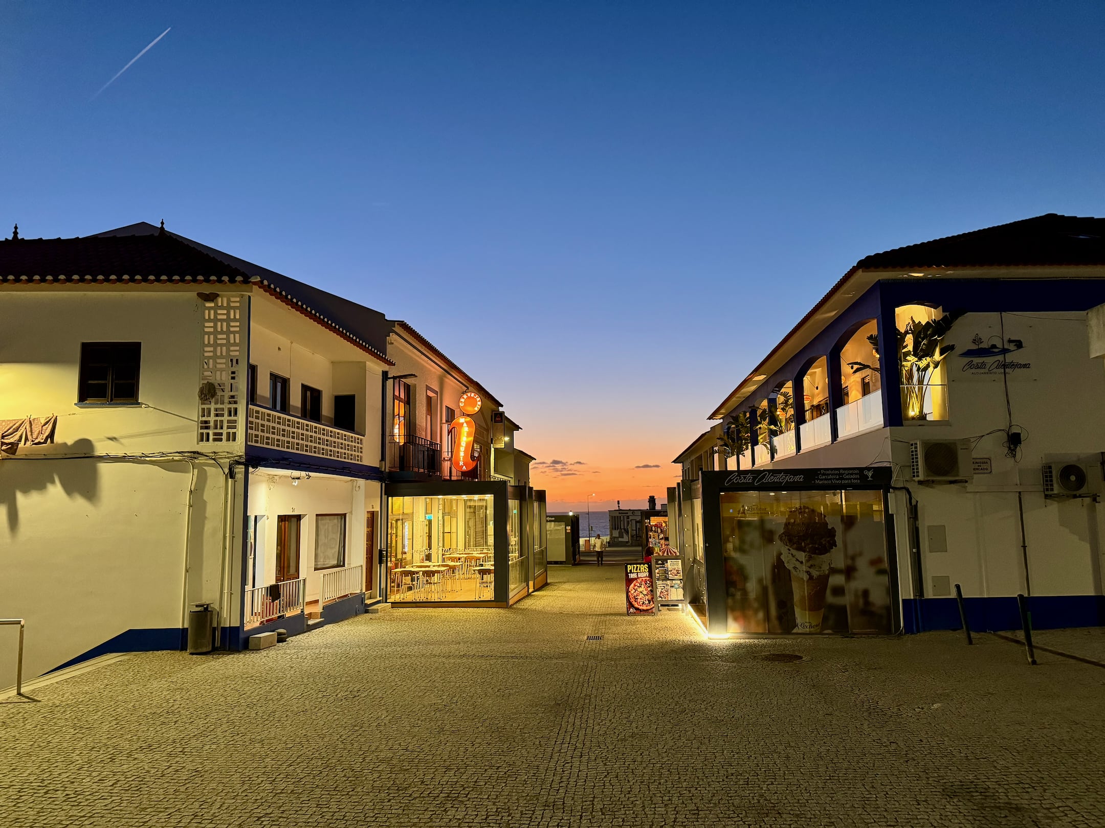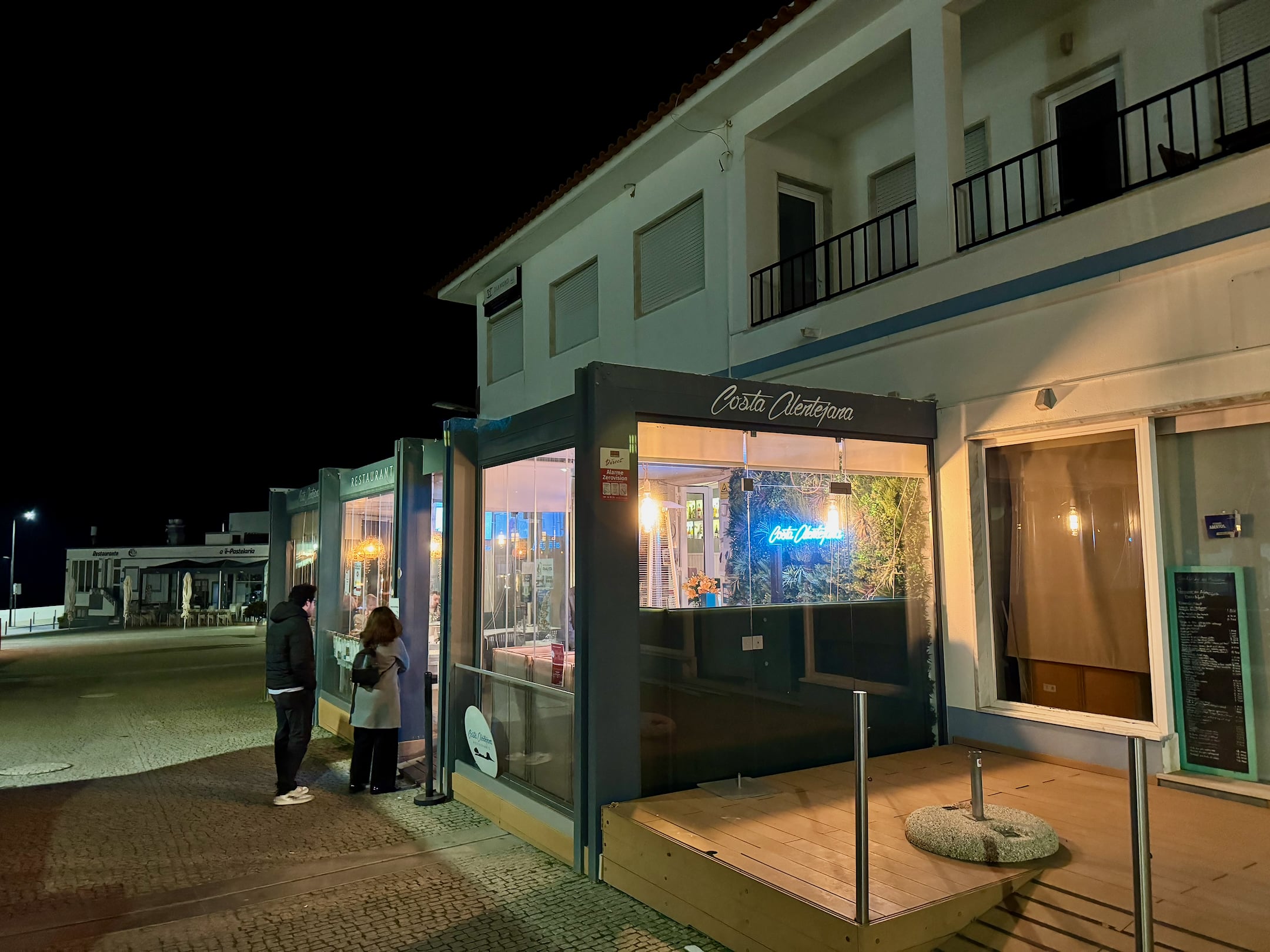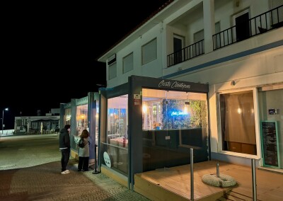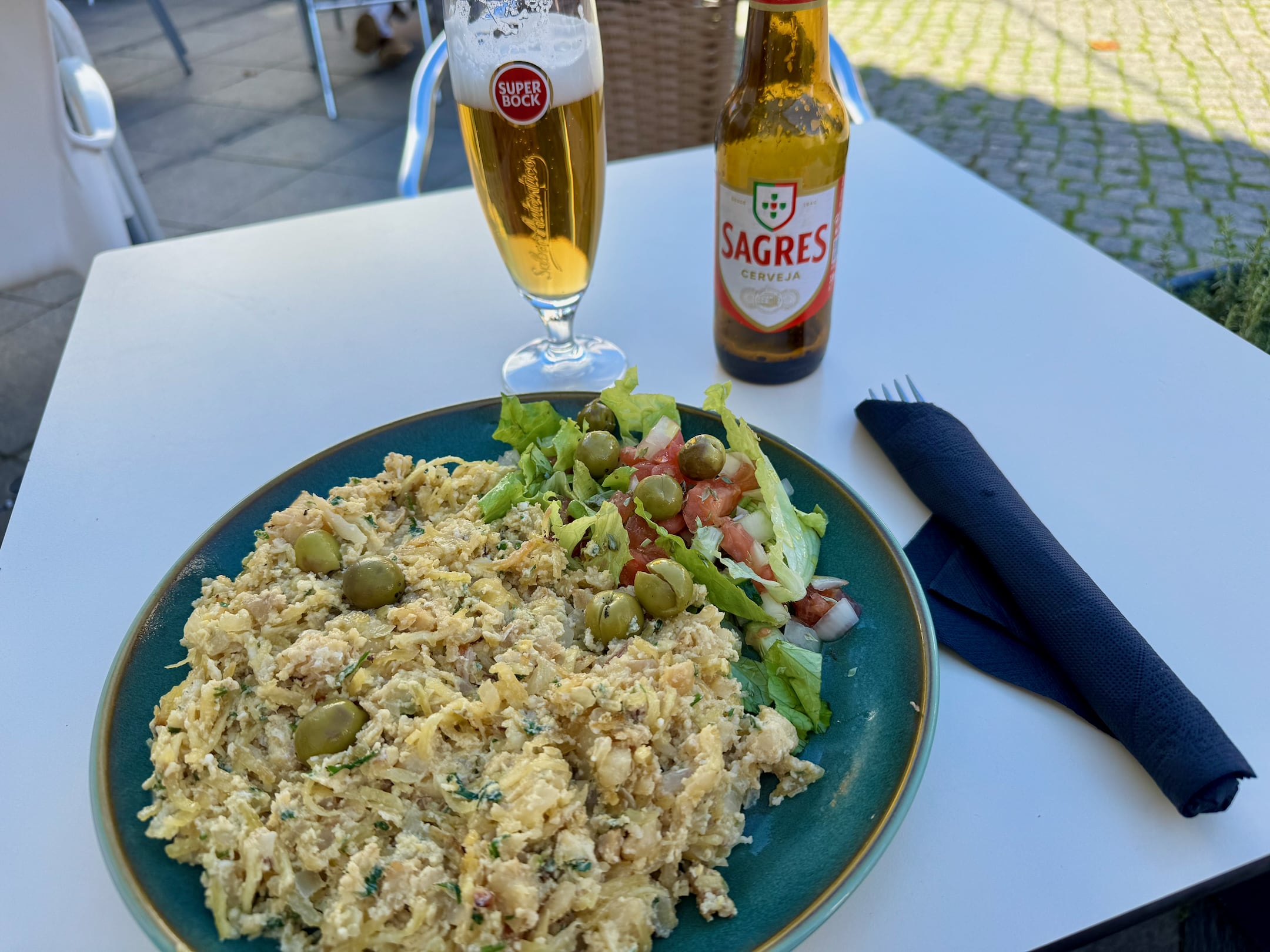Sympatický mladý číšník je u mě coby dup. Není divu, kromě mě má na starosti už jen jeden obsazený stůl. Koukám do lístku a po chvilce si vybírám grilovaného tuňáka a pivo. Za minut je číšník zpět a omlouvá se, že končí sezónu, a tak čerstvý tuňák není a pivo má jen v lahvi. Co se dá dělat, tak se ho ptám na místní specialitu – doporučí Bacalhau à Brás, což je je tradiční portugalské jídlo z tresky a brambor. Souhlasím, mám už docela hlad.