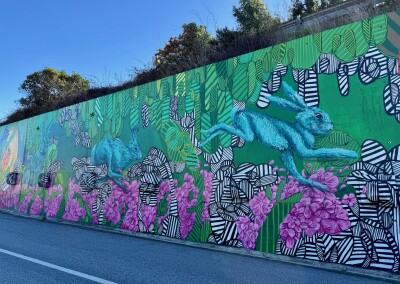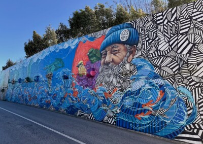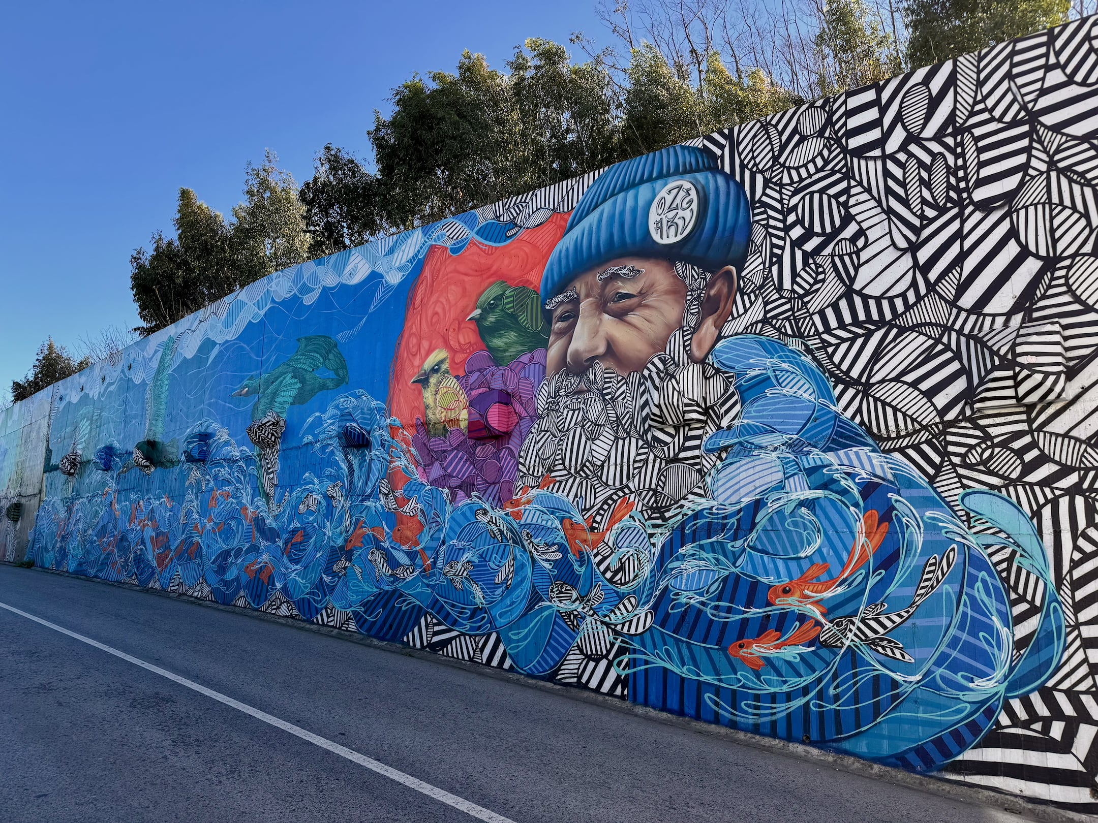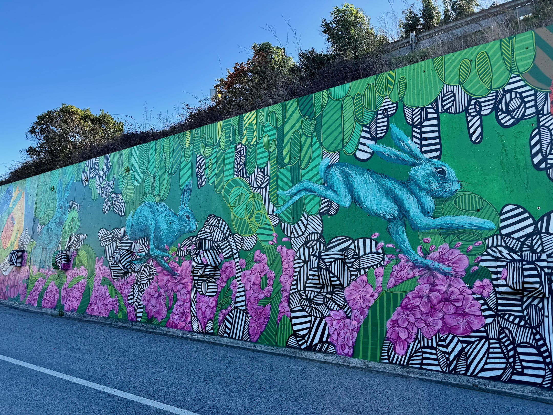 Jídlo bylo skvělé a pivo taky bodlo. Ale protože jsem se kvůli otáčení Země ocitl zase ve stínu a je mi zima, platím a loučím se. Vyrážím na druhou půlku dnešní etapy, čeká mě ještě asi 18 kilometrů. Zatím to byla hodně velká pohoda, nejsem ani unavený. Na odchodu z města obdivuji fakt obrovský mural a nápis města na kopci skoro jako mají v Hollywoodu!