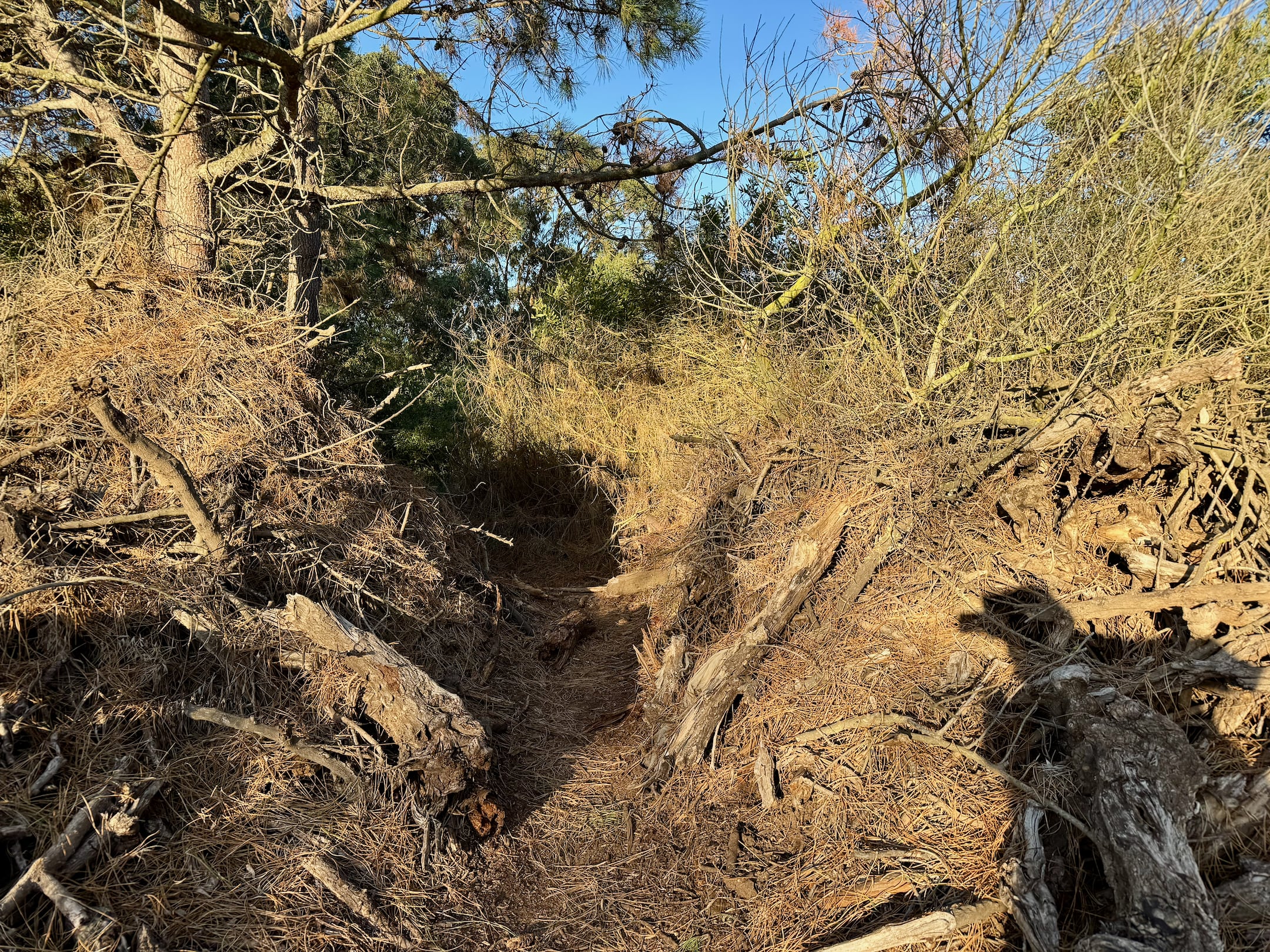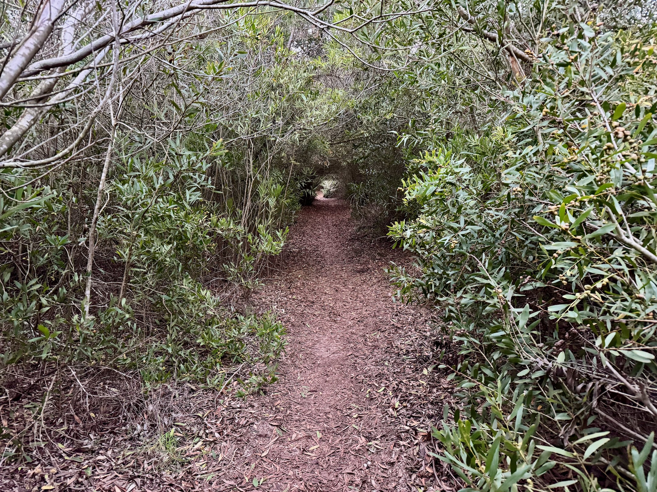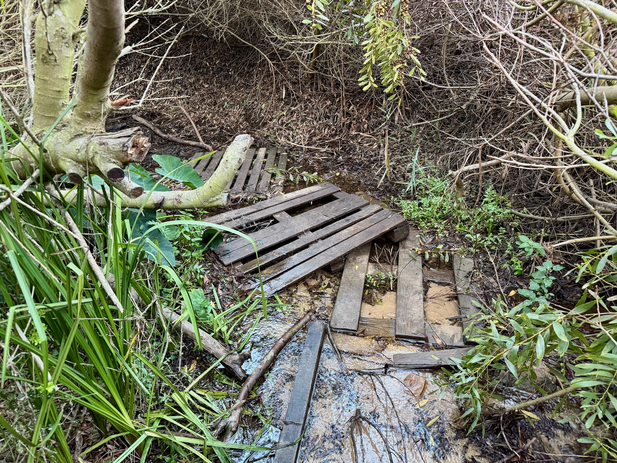 Chvilkový oddech na silnici kolem skleníků a nějakých dalších -íků je jen dočasný. Dlouhé a nízké tunely ve stromech jsou jen začátek. Rozbořené lávky, potůčky, průlezy trnitým křovím, úzké cestičky mezi kameny a skálami, bláto, mokrý písek, prudké sestupy a výlezy. Jako bych se z ničeho nic octl na úplně jiném treku. A to to tady očividně před velmi nedávnou dobou někdo upravoval, na keřích jsou patrné čerstvé řezy a na zemi je spousta poházených lehce uschlých větví.