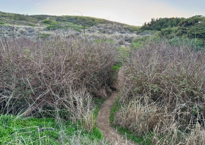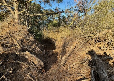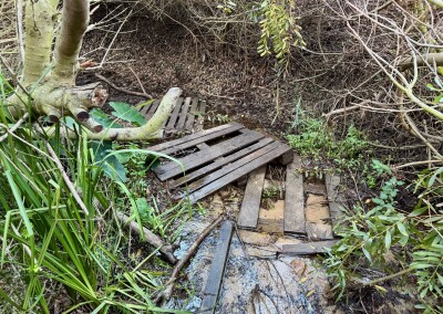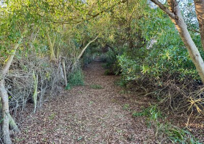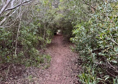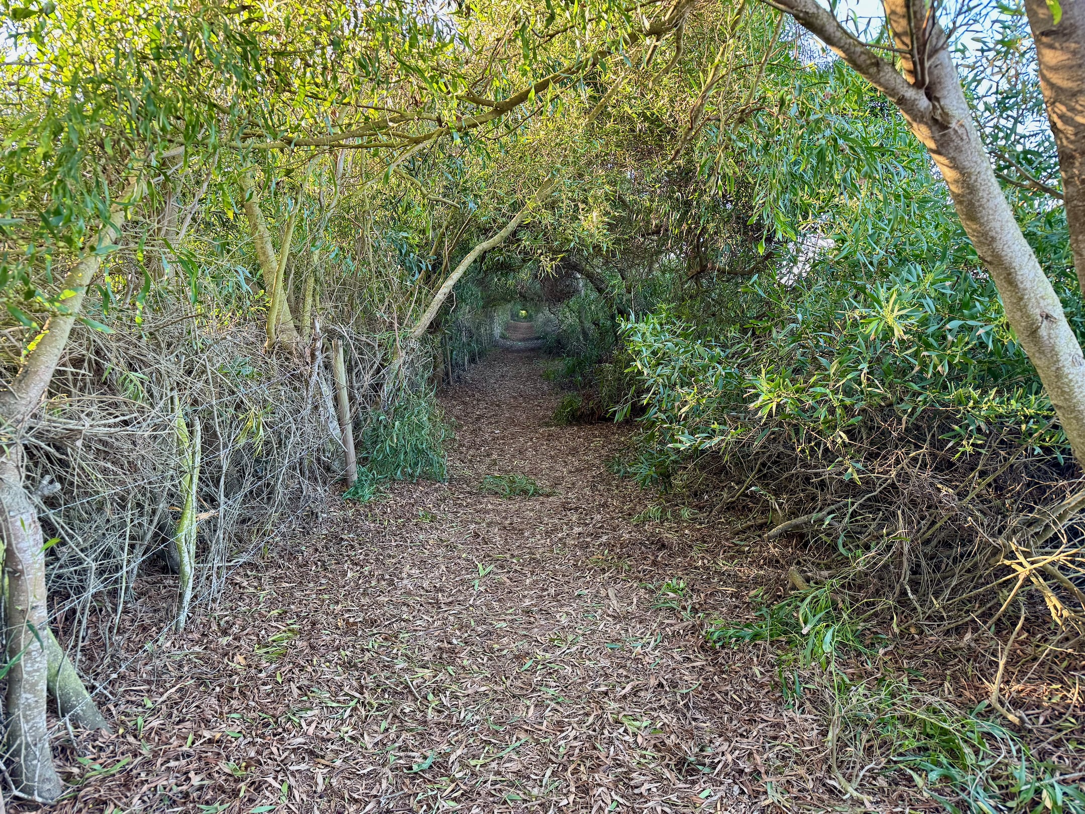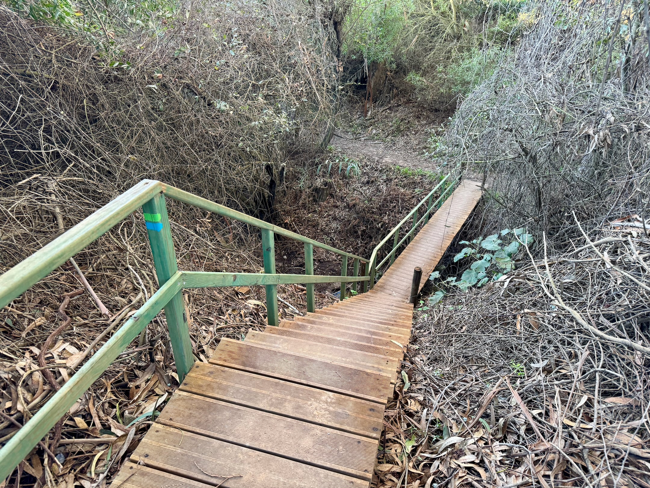 Chvilkový oddech na silnici kolem skleníků a nějakých dalších -íků je jen dočasný. Dlouhé a nízké tunely ve stromech jsou jen začátek. Rozbořené lávky, potůčky, průlezy trnitým křovím, úzké cestičky mezi kameny a skálami, bláto, mokrý písek, prudké sestupy a výlezy. Jako bych se z ničeho nic octl na úplně jiném treku. A to to tady očividně před velmi nedávnou dobou někdo upravoval, na keřích jsou patrné čerstvé řezy a na zemi je spousta poházených lehce uschlých větví.