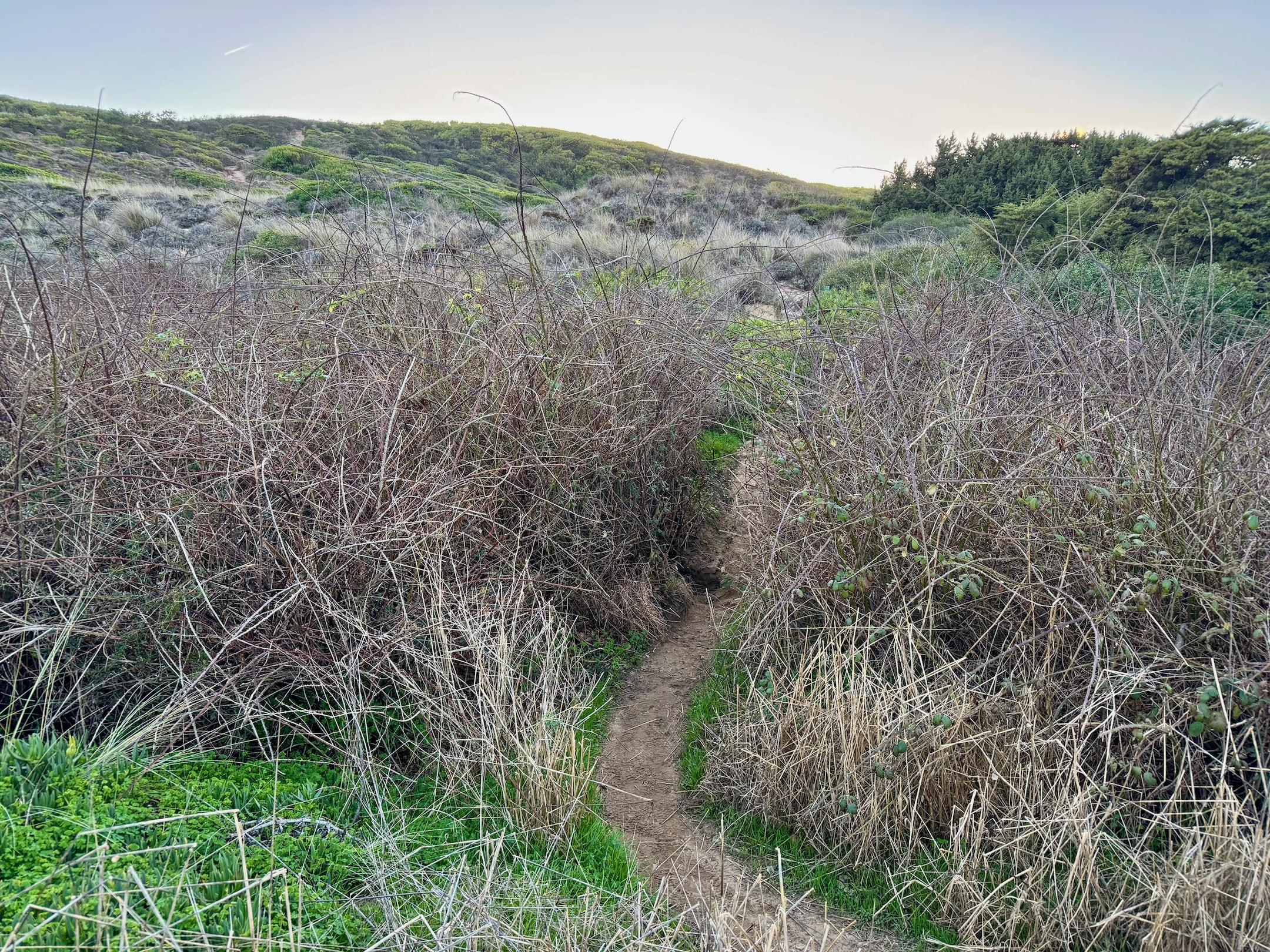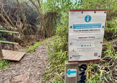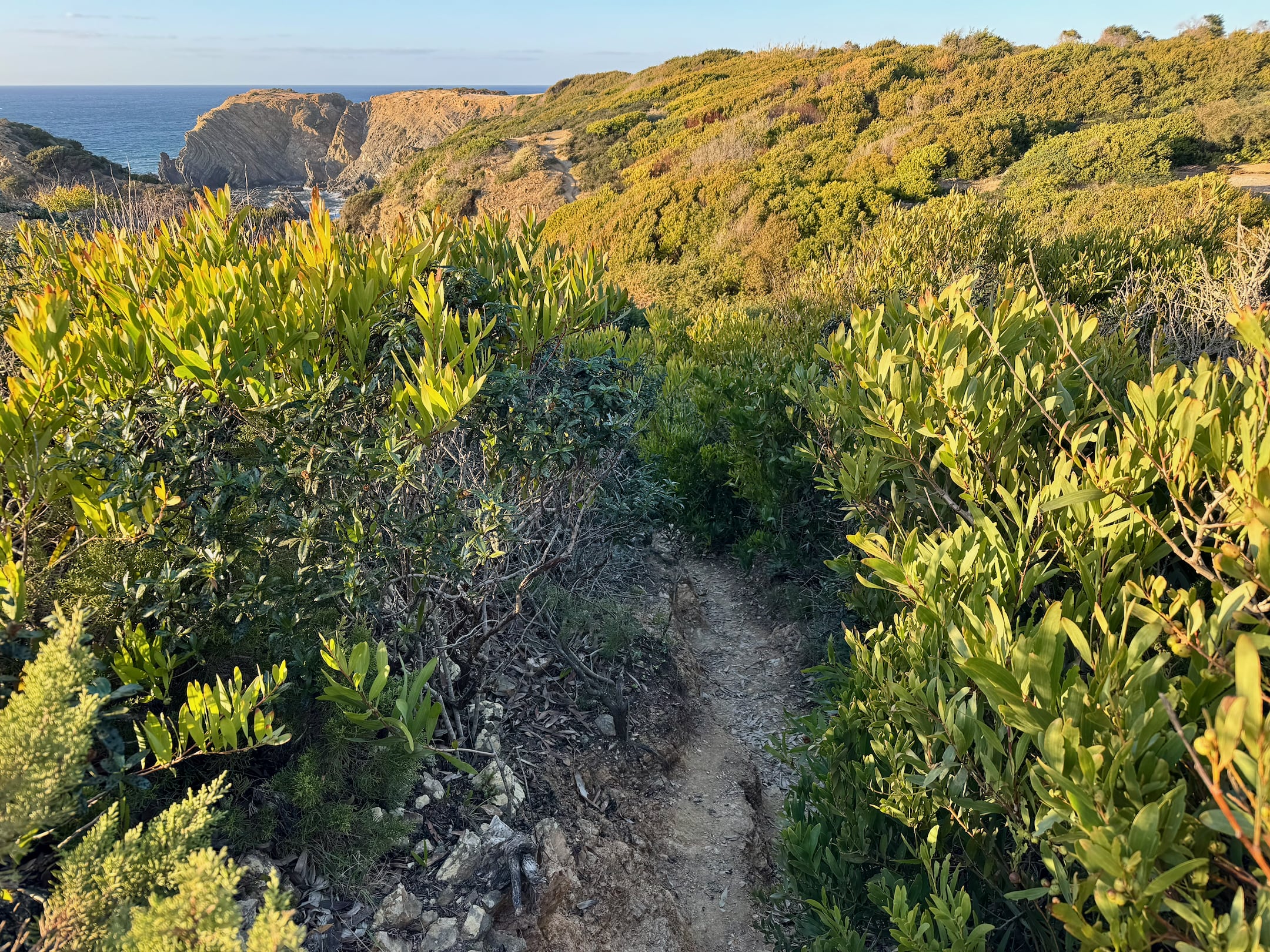 Azenha do Mar je jak po vymření. Všechno zavřené, minimum lidí, nemá smysl se tu zdržovat. Je půl čtvrté, do cíle to mám ještě asi 10 kilometrů, to bych měl na pohodu zvládnout za světla. Ani dalších pár stovek metrů nenasvědčuje, že by se to mělo změnit. Ale zdání klame. Všechno začne nově značeným úsekem, díky kterému si ušetřím minimálně kilometr vnitrozemím po další nudné obchozí trase. Nadšení ale vystřídá zděšení protože vegetace je tu až moc bujná. Průseky křovím, nízko visící větve, plot z ostnatého drátu, pichlavá křoviska, kluzké bláto. Jako by to tu trasoval Olaf. S krosnou celkově nic moc.