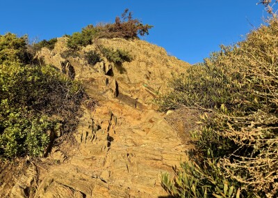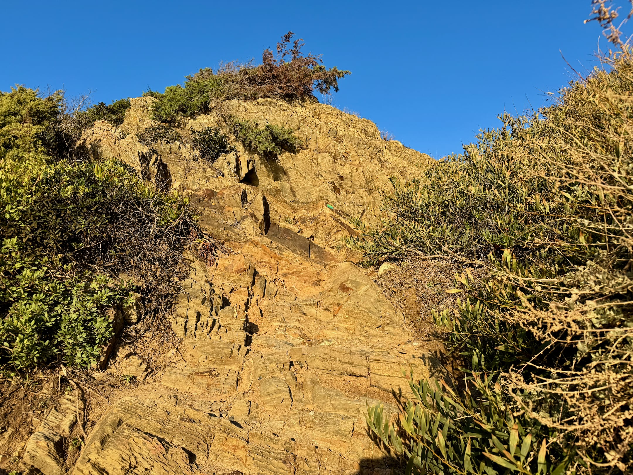 Cesta zpátky k moři vede zase po silnici, ale tentokrát asi uzavřené, protože kromě turistů a několika cyklistů tu neprojelo ani auto. Najedený jsem spokojený, užívám si přírodu, sluníčko a rychlé tempo. V půl třetí jsem zase na dohled moře a stoupám po skále do prudkého kopce.