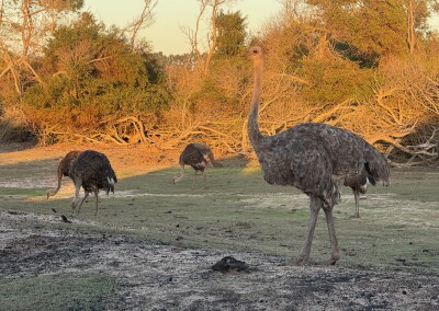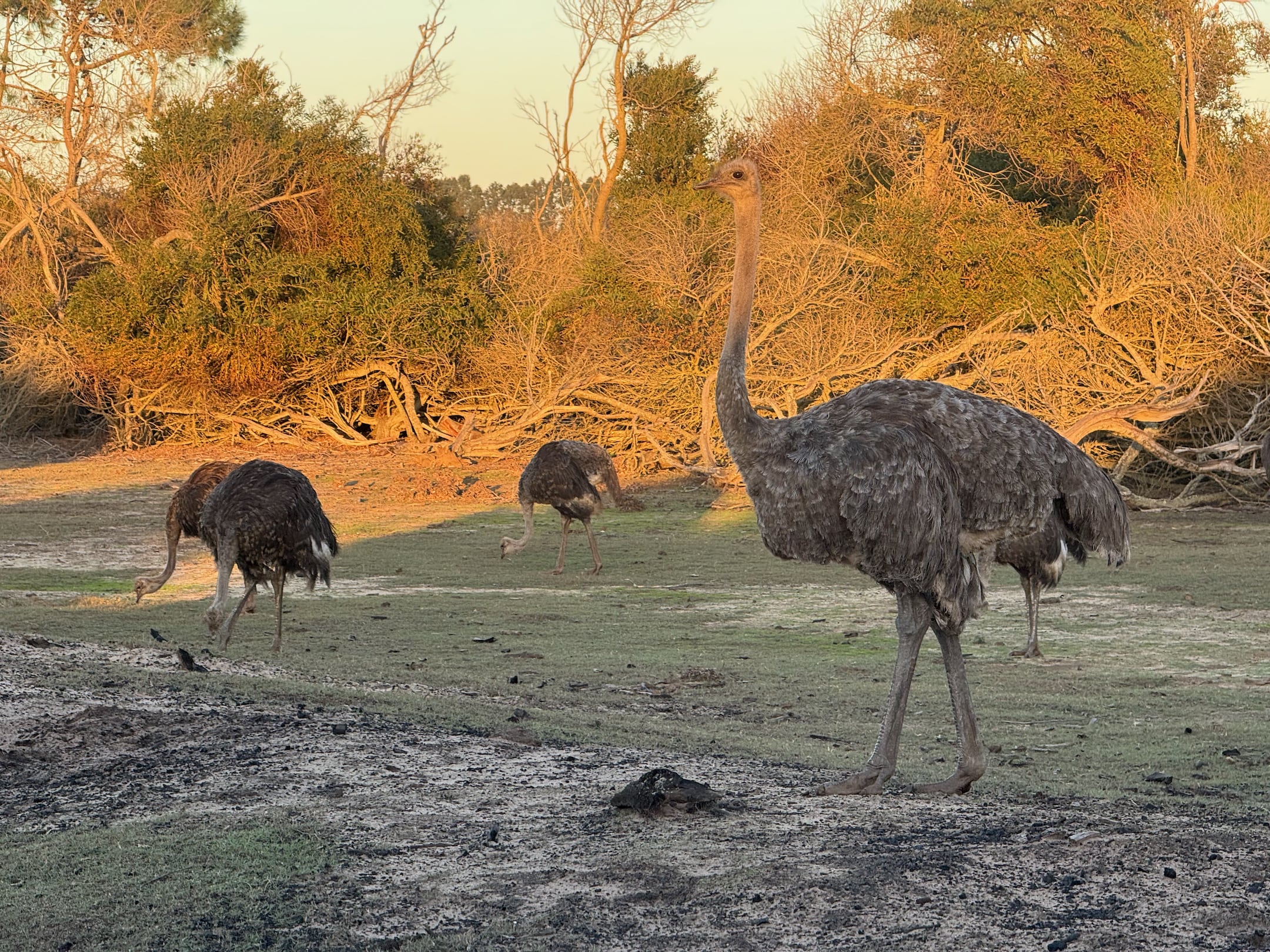 Když přesně v 5 hodin odpoledne vylezu z jednoho takového hustého křoví, najednou si koukám z oka do oka s obrovským pštrosem. Halucinace? Ne, pštros je skutečný! Fascinovaně na sebe mrkáme. Nebojí se, přijde tak blízko, že už nemůžu ani zaostřit. Docela bych se tu zdržel, ale za půl hodiny se začne smrákat a já mám před sebou ještě skoro 5 kilometrů. V tomhle terénu je to na 2 hodiny!