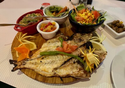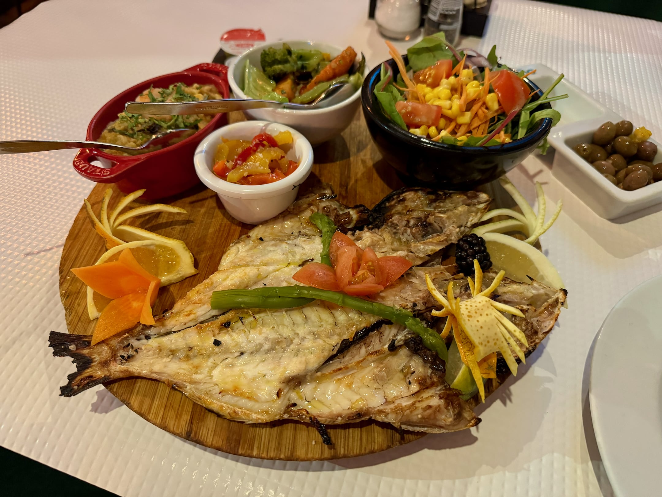 Za hodinu jsem zpět. Bylo to luxusní – smažený předkrm, grilovaná „růžová ryba“ (když číšník seznal mé znalosti mořských ryb, raději mi ji před přípravou přinesl ukázat, naštěstí už neživou), domácí hranolky a pivo. Pochutnal jsem si náramě, snědl všechno včetně oblohy a pak zaplatil €45 i s dýškem.