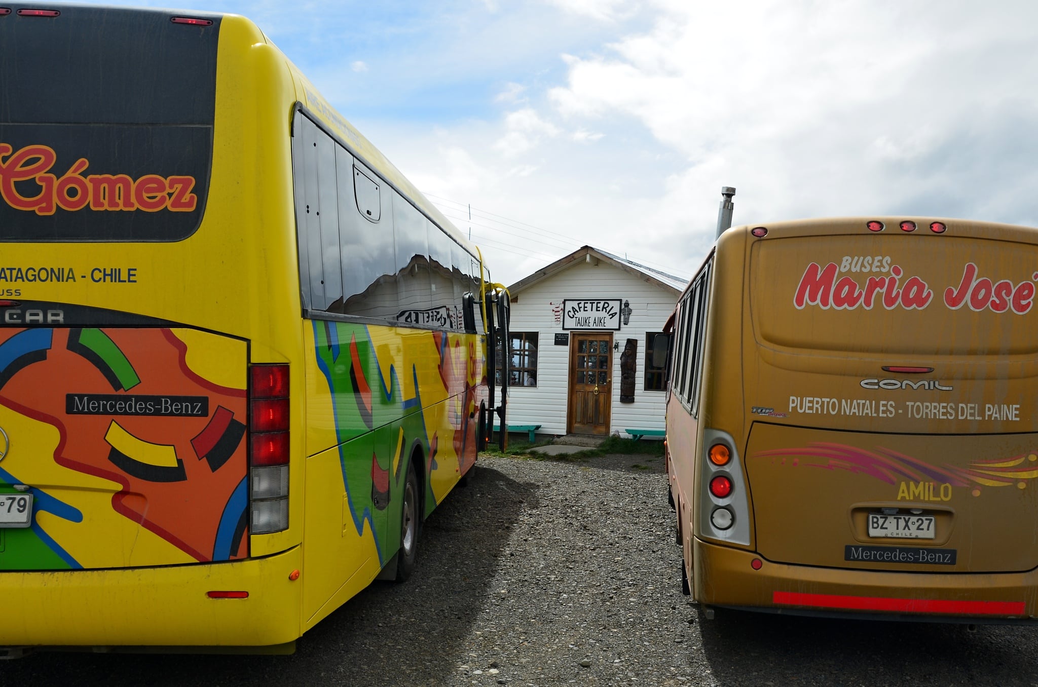 Nejdříve musíme koupit lístky na druhou část cesty do národního parku. Úkolu se ujímá Hanka a obchází několik cestovních kanceláří, která mají okénka přímo na autobusovém nádraží. Nakonec se rozhoduje pro cestu s kanceláří Via Paine a kupuje dva lístky na 14:30, což ulehčí naší hotovosti o 7.500 pesos za osobu. Máme tedy něco přes dvě hodiny na to dovybavit se do divočiny a vrátit se zpět. Na informacích se snažíme zeptat na nejbližší outdoorový obchod, ale bez úspěchu. Tak razíme naslepo a na vlastní pěst.