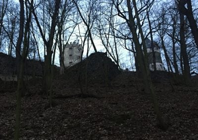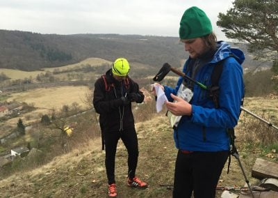 Kopec k hradu je sice prudký, ale relativně krátký, takže se už za pár minut zahřívám dalším čajem a nechávám se zapsat sympatickým pořadatelem na kontrole číslo 5. Sešla se nás tu malá skupinka, kromě čaje snídáme i obložený chleba nebo nějaké sušenky. Ale ani tady není důvod se moc dlouho zdržovat, vdechnu chleba a jsem zase na cestě. Tentokrát v první fázi asfaltové a dost prudké, takže nohy bolavé ze srázu pod lanovkou bolí víc a víc. Naštěstí to trvá jen necelý kilometr, pak trasa zahne do lesíka, kde se kluše přeci jen lépe.