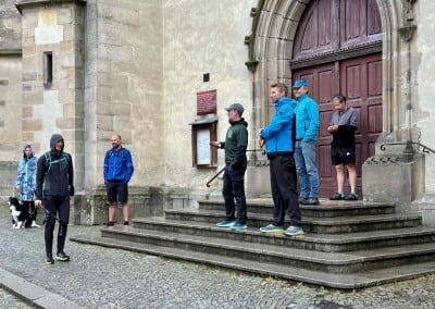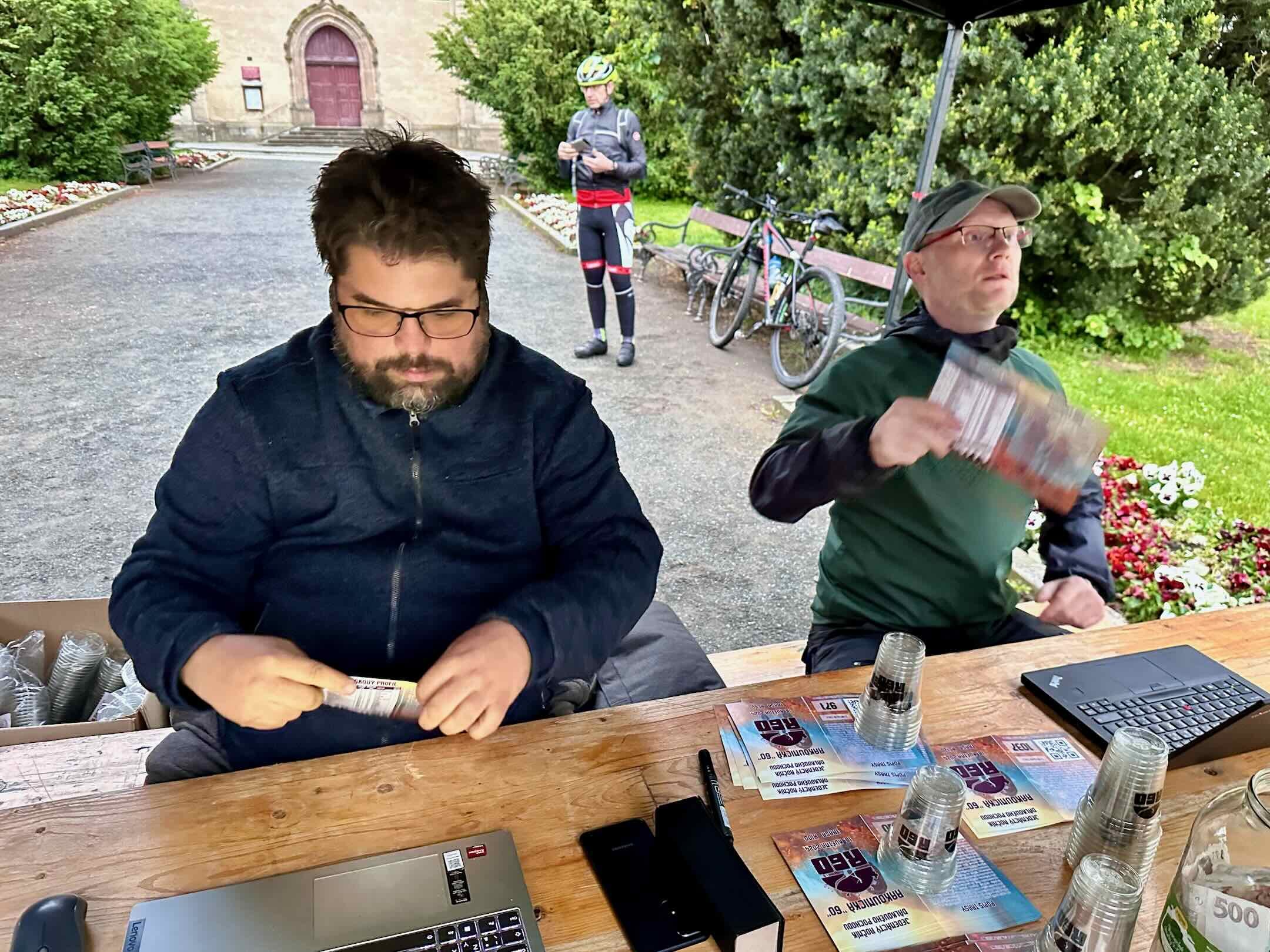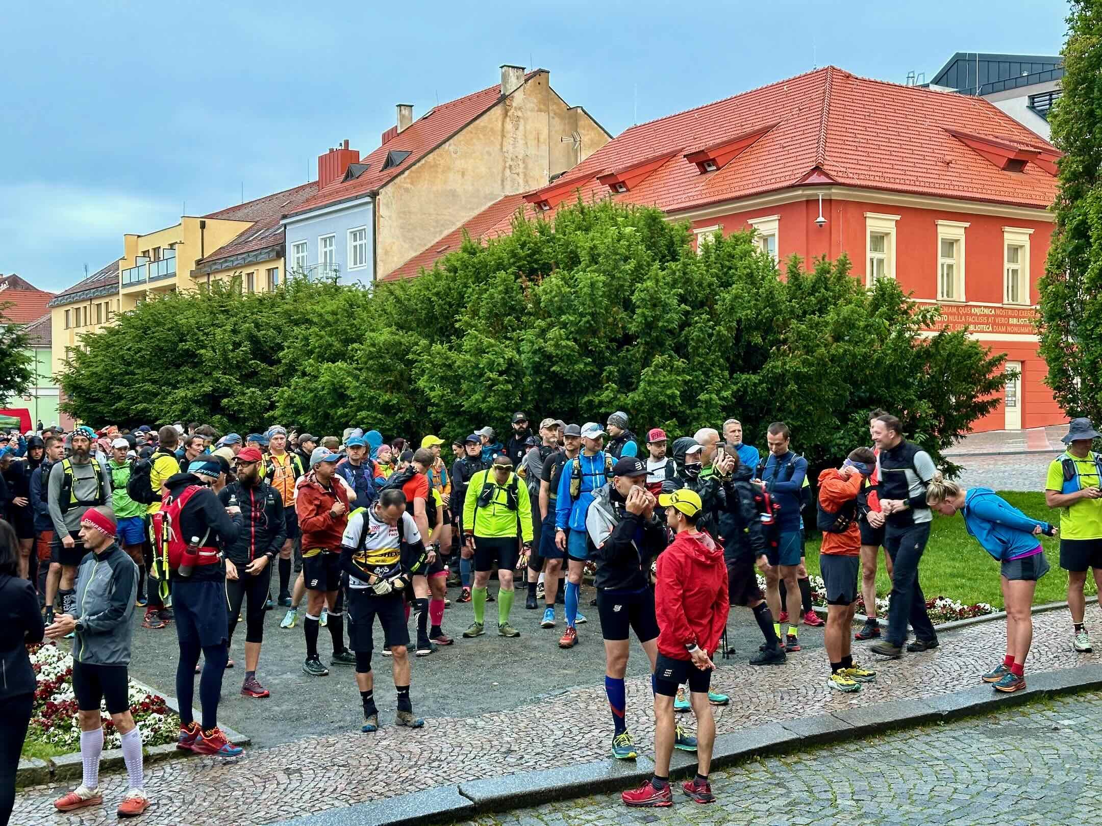 Na náměstí v prostoru startu už to celkem žilo. Pod přístřešky schovaní organizátoři pilně odbavovalli jednotlivé žadatele, na mě vyšel Olaf. Po krátké konverzaci mi podal kontrolní kartičku s číslem 719, do připravené sklenice jsem vsunul bankovku přiměřené hodnoty a vydal se zpátky k autu, doobléknout se, přezout a připravit na start. Teplo sice vypadá jinak, ale po zimní otužovací kůře je má tělesná schránka přeci jen odolnější, proto mám na sobě jen kraťasy a tričko s krátkým rukávem. Teplejší merino mám ale pro jistotu v batohu. Zamykám auto a vracím se do prostoru startu.