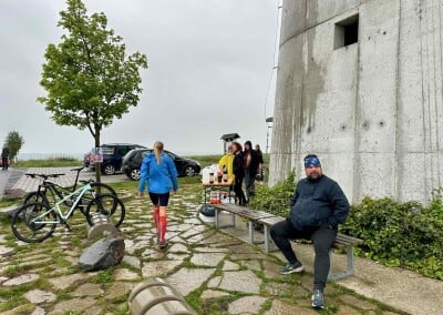 Po překročení silnice 233 se přede mnou v dálce vynoří rozhledna na Senecké hoře. Trochu se ztrácí v mracích a mlze. Vyklusávám a doufám, že to letos na kontrole bude bez fronty – není zrovna teplo na to strávit pět minut na schodech v profukující kovové věži… Naštěstí se ukáže, že v tomto počasí se asi nikdo nechce moc kochat a zdržovat, protože když dorazím až pod rozhlednu, jsem tam skoro sám. Teda až na Olafa a pár dalších organizátorů a organizátorek. Olaf na mě ještě volá, že tentokrát bych se měl obejít bez DNF a měl dojít až do cíle, ale to už vybíhám po točitých schodech až nahoru pro první kontrolu. Do kroku mi k tomu hraje hodně hlasitě moderní hudba, pak se vracím na zem a kontroluju čas. Je zhruba stejný, jako loni. Měl jsem v plánu být trochu rychlejší, ale o nic nejde a zatím se mi běží v pohodě.