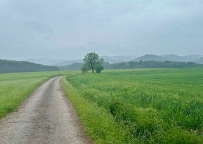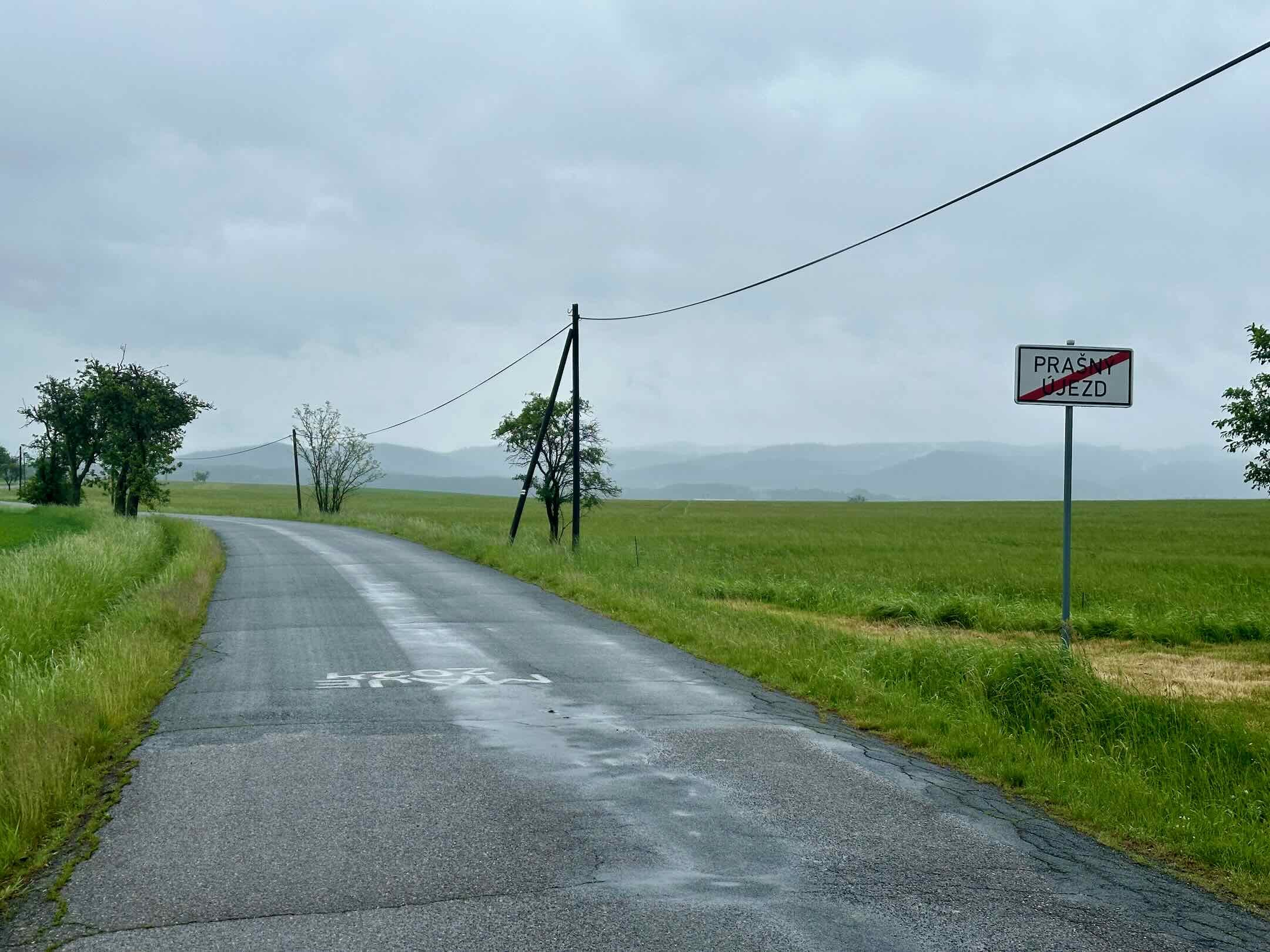 V obci Třebnuška se napojím na silnici čeká mě takový nudnější, ale méně náročný úsek převážně po rovině. Pro změnu zase prší, takže jediné zpestření představuje jakýsi pán v autě s přívěsem plným dřeva, který mě přemlouvá, že mě kousek sveze. Že za 2 kilometry stejně vede trasa vedle jeho baráku, tak jestli si to nechci trochu zpříjemnit. S úsměvem odmítám, čemuž se trochu zdráhá uvěřit, ale pak mi zamává a jede dál.